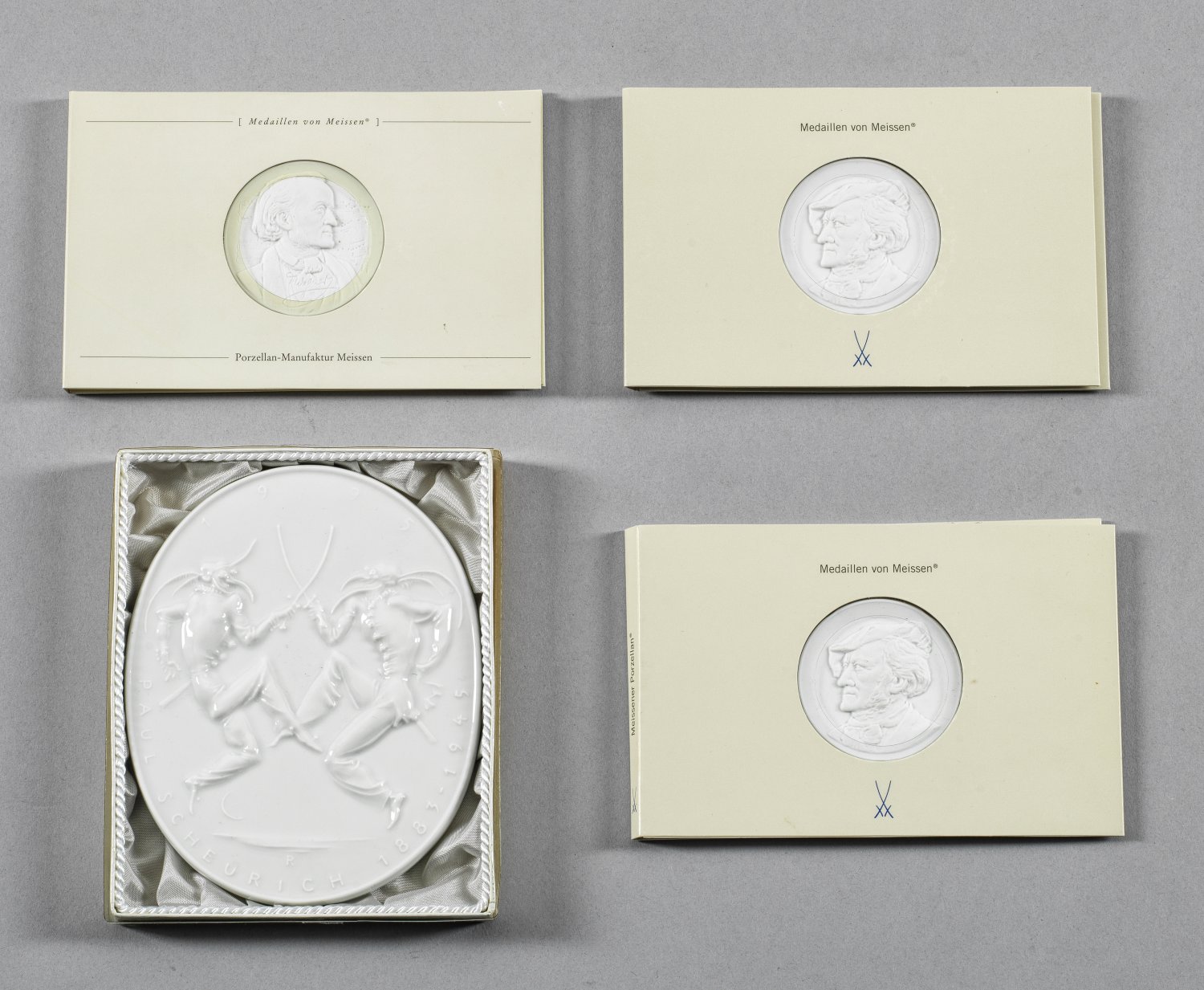 Ovale Jubiläumsplakette aus Weißporzellan mit profiliertem Rand anlässlich des 50. Todestages von Paul Scheurich. Schauseitige Reliefdarstellung von zwei maskierten Harlekinen aus der Commedia dell'arte nach Jacques Callot, bez. "Paul Scheurich 1883-1945" mit Jahr 1995. Rücks. Wandaufhängung. Drei runde Porträtmedaillen aus Biskuitporzellan mit reliefplastischer Porträtdarstellung von Richard Wagner im Profil. In Originalschachtel bzw. originalen Passepartouts. Schwertermarke. Plakette 13,5 cm x 11 cm, Medaillen-D. 5 cm.