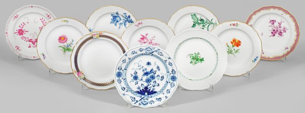 10-tlg.; Runde Form mit leicht vertieftem Spiegel. Teilw. passig geschweifte Fahne. Verschiedene, hauptsächlich florale Motive. Teilw. polychrome sowie Camaieumalerei in kupfergrün, kobaltblau und purpur, teilw. mit Goldrand und -staffage. Schwertermarke. Teller-D. 24,5 cm - 26 cm.