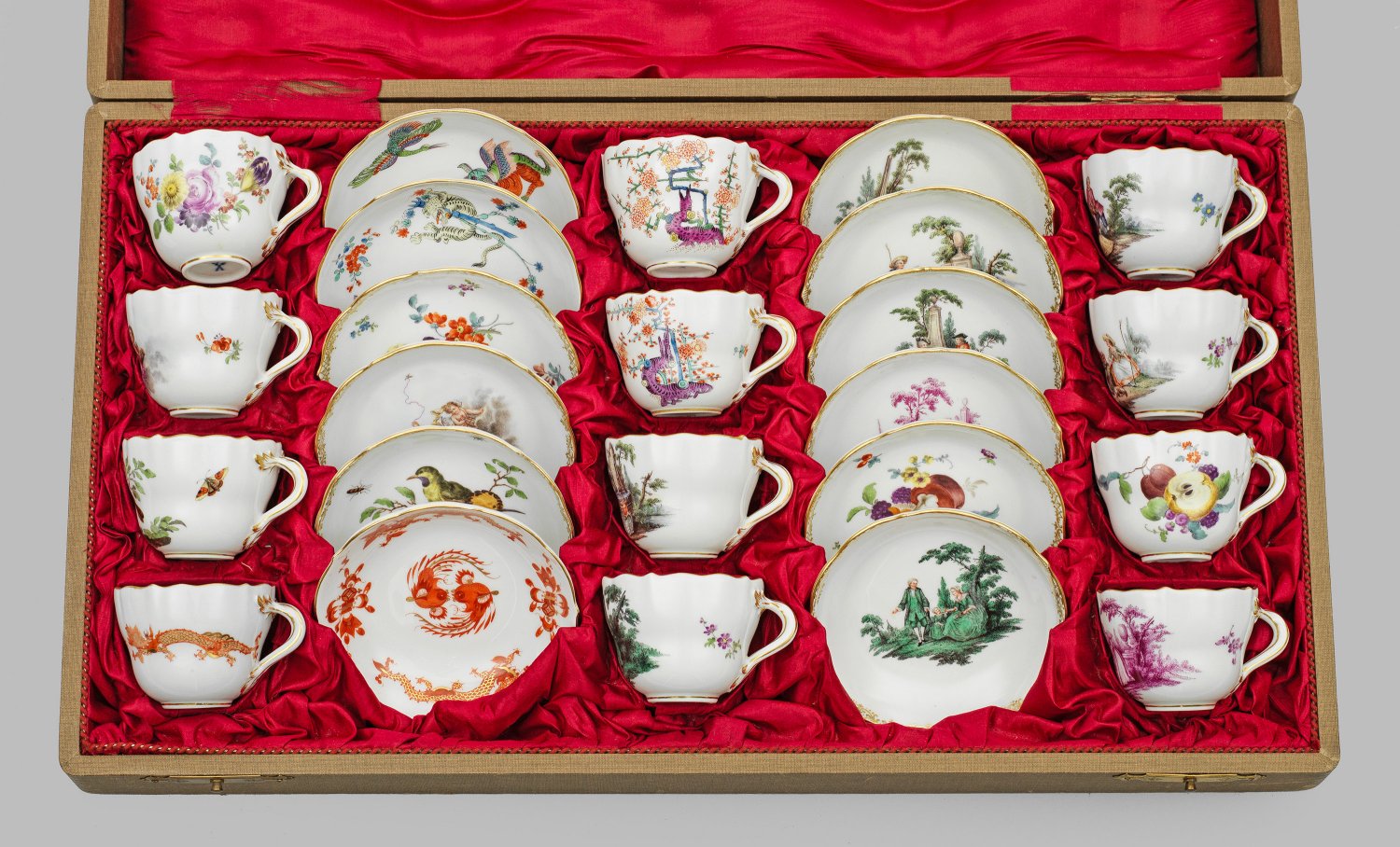 auf Untertassen in scharnierter Schatuelle (um 1900). Verschiedene Dekore: "Roter, reicher Drache", "Gelber Tiger", Blumen-, Früchte- und Vogeldekor, "Boucher-Putten" in polychromer sowie Kupfergrün- und Purpur-Camaieumalerei. Teilw. Goldspitzenbordüren. Schwertermarke. Tassen-H. 5 cm.