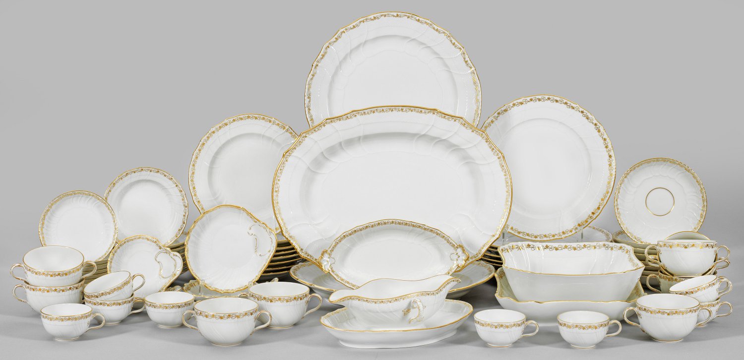 50-tlg.; 8 Speise- und 8 Vorspeiseteller, 8 Tee- und 8 Suppentassen mit Untertassen, Beilagen-, 8 Dessert-, 2 Anbiet- und 4 Muschelschalen, Sauciere, Anbiet-, Torten- und Bratenplatte. Reliefdekor "Neuosier" mit Goldrand und den Rand säumenden Weinlaubranken in Gold. Zepter- und Malereimarke. Bratenplatten-L. 40 cm. Teller-D. 22 cm - 26 cm.