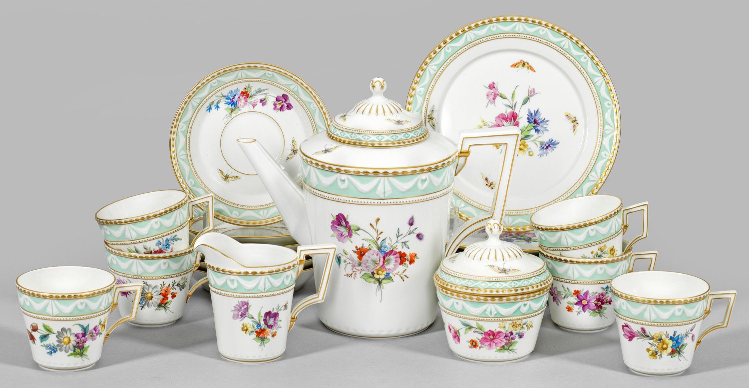 für 6 Personen. 15-tlg.; Kaffeekanne, 6 Kaffeetassen mit Untertassen, Sahnegießer, Zuckerdose, 6 Kuchenteller. Auf Wandung, Deckel und Fahne umlaufend feine Bordüre mit reliefierten Perlstäben und Tuchgehänge vor einem türkisfarbenen Fond. Farbenfroher Dekor aus sommerlichen Blumengebinden und Schmetterlingen in polychromer Malerei. Goldstaffage. Zepter- und Malereimarke. Kannen-H. 22 cm