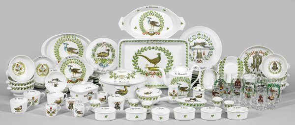 56-tlg.; 6 Kaffee-, 3 Mokkatassen mit Untertassen, Kaffeekanne, Milchkännchen, 6 Speise-, 6 Dessertteller, Schmalzterrine, Senftöpfchen, Pastetenform, Servierplatte, 6 Vorsuppenschalen, 5 Eierbecher, Stielkasserolle, 3 Buttermuscheln, 6 Souffléförmchen (Ramequins), Sauciere, Gratin- und 2 Auflaufformen, 4 Eierplatten. Dekor "Chambord". Mit verschiedenen Vögeln, Kaninchen, Jagdausrüstung und schleifengeschmückten Blätterkränzen. Farblithographiedruck. Beigabe: Mokkatasse, 5 Wassergläser, 7 Schnapsgläser mit korrespondierendem Dekor. Teilw. rep./best.; Haarrisse; Manufaktur- und Firmenmarke. Auflaufformen L. 29cm - 36 cm, B. 20 cm - 26 cm.