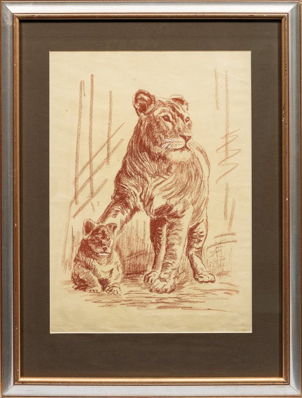 Feinfühlig und subtil geschilderte Studie einer Löwin mit ihrem Jungtier. Stil- und sujettypische Darstellung Dills, der eine Vorliebe für Raubkatzen besaß. Rötelkreide, weiß gehöht/Papier. Blatt 43,4 cm x 31,3 cm. Rahmen.