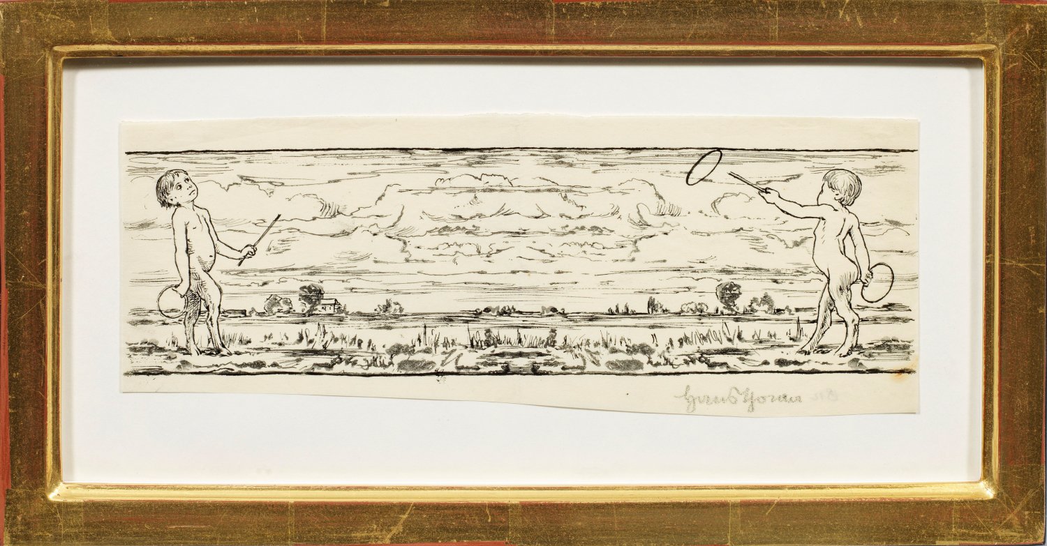 Annähernd symmetrische Jugendstil-Darstellung, wohl als Entw. für eine Vignette als Buchillustration, vergleichbar mit denen im Buch "Federspiele" von Hans Thomas und Henry Thode, das in drei Auflagen 1892 bis 1919 erschien. Feder/Papier. R. u. sign.; Ca. 10,2 cm x 27,8 cm. Rahmen.