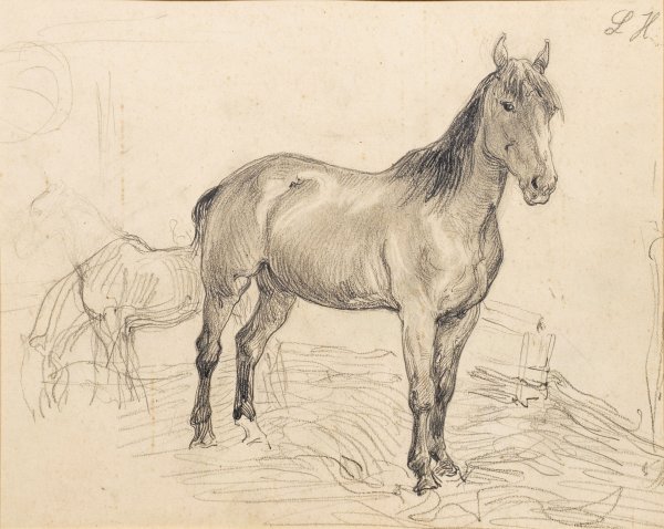 Gekonnt flüchtig eingefangene, naturgetreue Studie Hartmanns, der sich mit Hingabe dem Studium von Pferden widmete und diese in vielen, meisterhaft lebendig wirkenden Darstellungen wiedergab. Bleistiftzeichnung/Papier. R. o. monogr.; Blatt 28 cm x 36,1 cm. Rahmen.