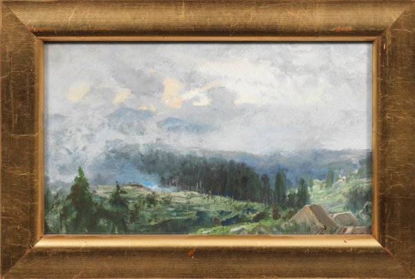 Von erhöhtem Standpunkt öffnet sich der Blick auf das im Morgennebel liegende Harzgebirge. Gouache/Bütten. R. u. sign. und mit Ortsangabe D(üsseldorf). 16,5 cm x 27 cm. Rahmen.