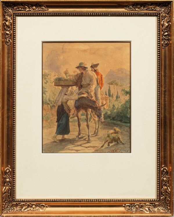 Subtil und feinfühlig gemalte Genredarstellung in einer stimmungsvoll angelegten, italienischen Landschaft, vermutlich entstanden im Zuge einer Italienreise, die der dänische Künstler zwischen 1846 und 1851 unternahm. Aquarell/Papier. R. u. sign. und dat. (18)51. Passepartoutausschnitt 21,3 cm x 17 cm. Rahmen.