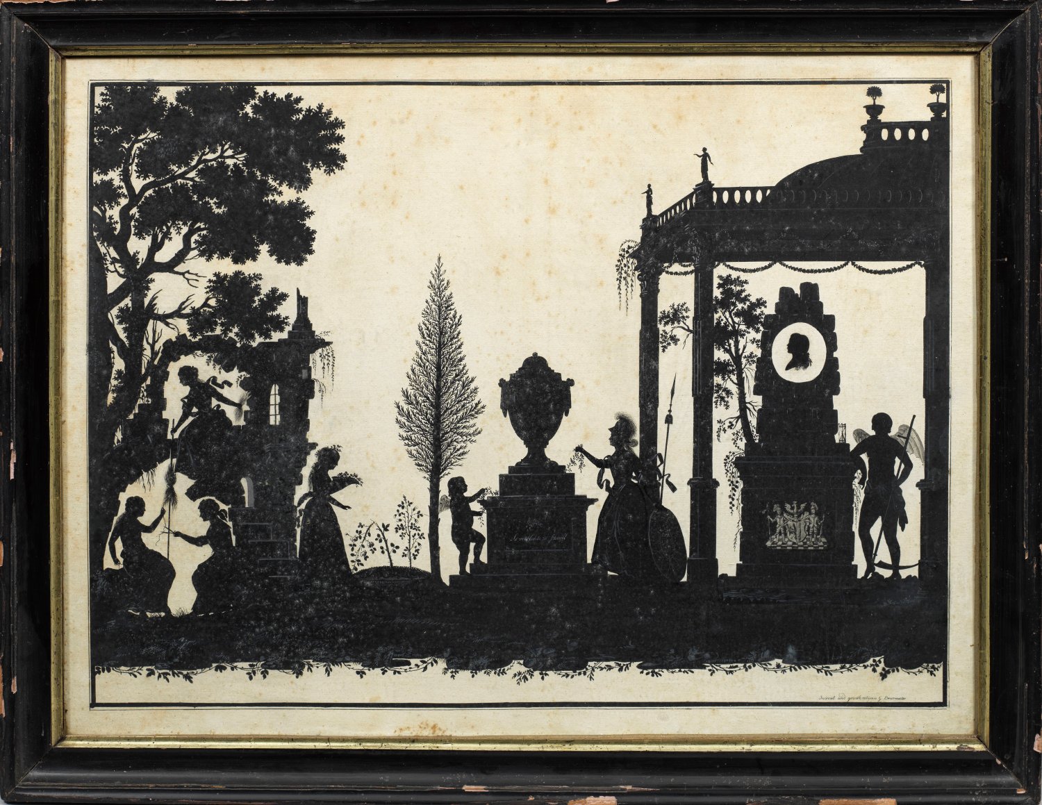 In Schattenrissmanier ausgeführtes, gezeichnetes Blatt. Auf einem Landschaftssockel verschiedene allegorische Darstellungen. Links eine fantasievolle Ruinenarchitektur mit den drei Parzen, Fortuna und abgebrochenem Rosenstock; mittig eine Urnenvase auf Sockel mit Inschrift "Sie verblühte zu schnell", bekränzt von einem Engel und einer Minerva; rechts unter einem Baldachintempel ein Denkmal mit Porträtsilhouette und Wappen, flankiert von einem Todesengel. Feder u. Deckweiß/Papier. R. u. sign. "Invenit und gezeichnet von G. Bormester". Ger. stockfleckig. 61 cm x 82 cm. Rahmen.
