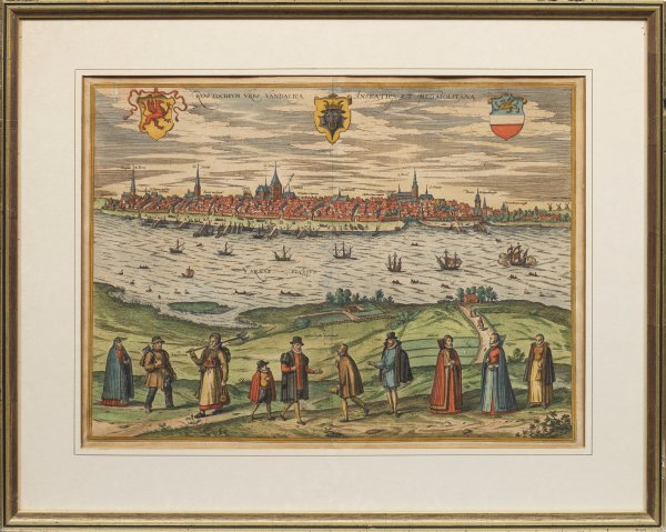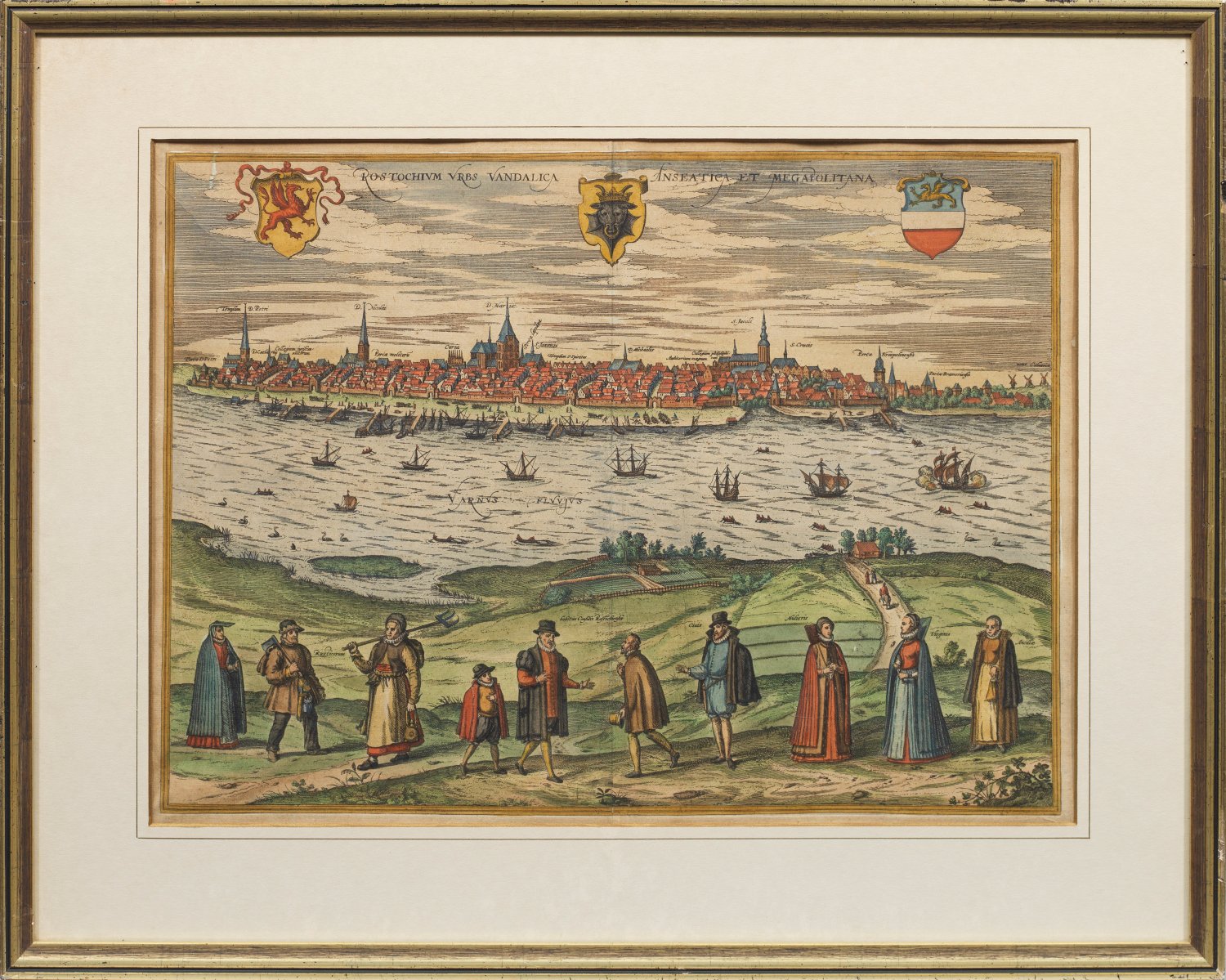 Altkolorierter Kupferstich/Papier. Erschienen in Georg Braun und Franz Hogenberg, Civitates Orbis Terrarum, Bd. V, 1597. Dekorativer Blick auf die Hansestadt Rostock über die Warnow, die von reger Schiffsstaffage belebt wird. Im Vordergrund flanieren zehn Bürger in charakteristischer, zeittypischer Kostümierung. Die Titelinschrift im Himmel wird von drei Wappenschilden begleitet, dem pommerschen Greif, dem mecklenburgischen Stierkopf und dem Rostocker Stadtwappen. Darstellung 35,5 cm x 48,8 cm. Rahmen.