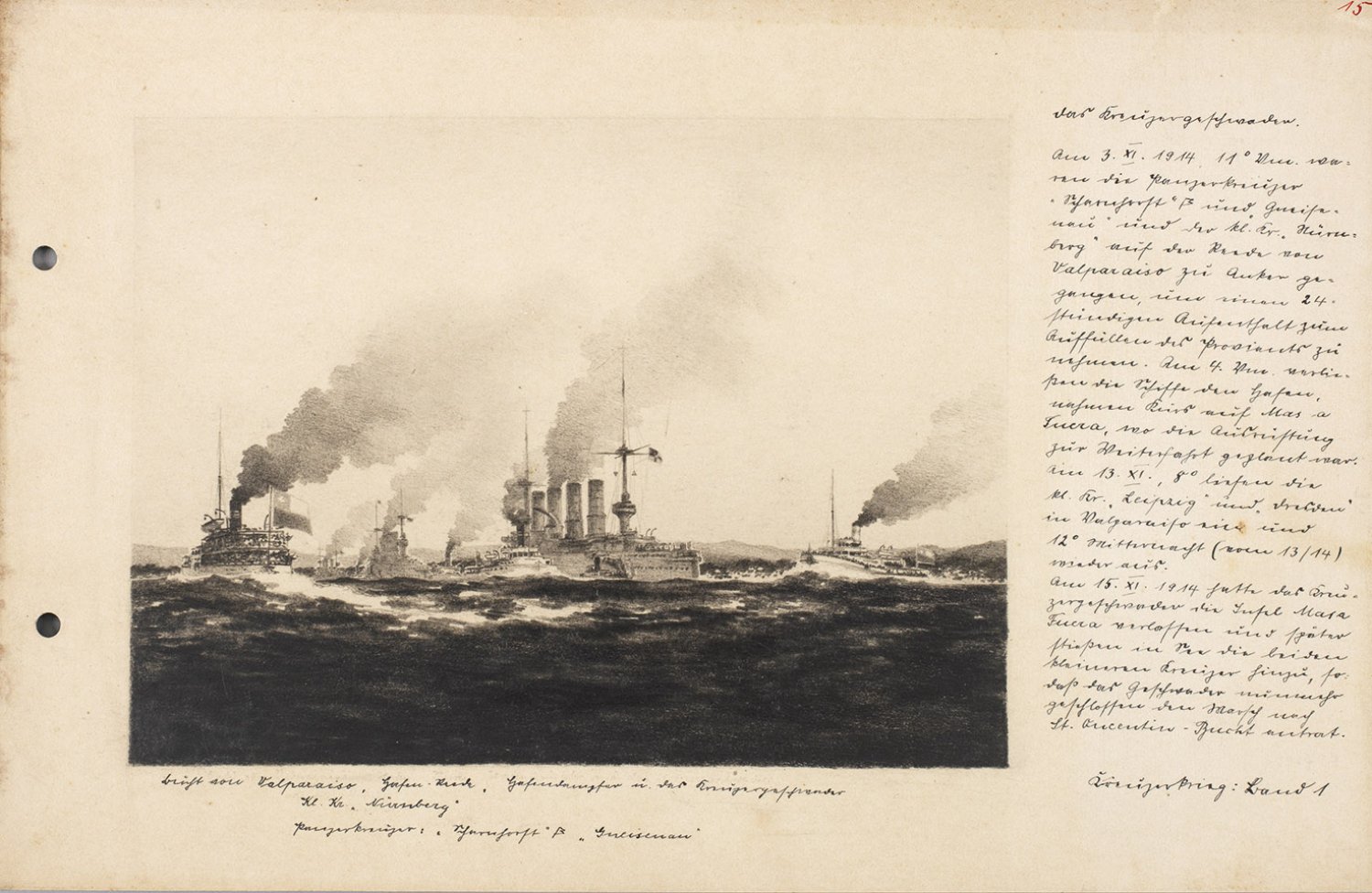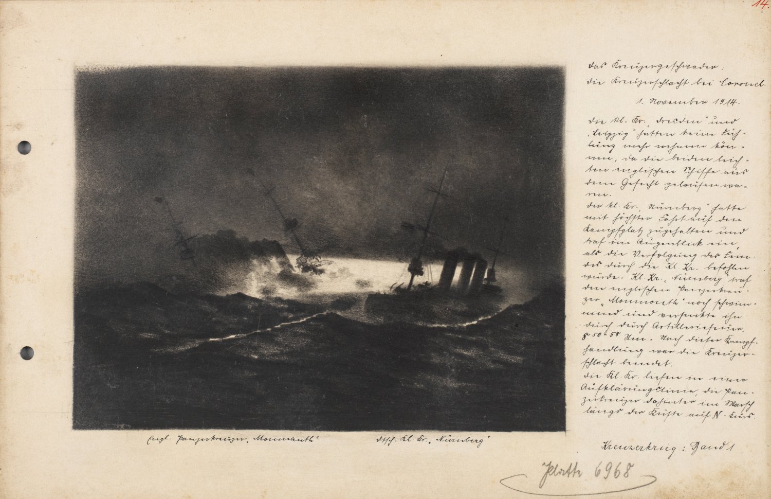 Durch Hans Schubert (1895 - 1971) zeitnah in subtiler Bleistifttechnik ausgeführte, Schwarzweißfotografien gleichkommende Grisailledarstellungen verschiedener Kriegsschiffe und Schlachten auf hoher See. Jeweils zugeordnet Texte und Angaben (in schwarzer Feder und Bleistift), teilw. dat. 1914. Die Bilder dienten offenbar als Vorlagen für ein Buch oder eine Dokumentation der Reichsmarinesammlung im Museum für Meereskunde in Berlin (bestehend 1900-1945). Bleistift/Karton. Verso teilw. Stempel "Museum für Meereskunde (/) Reichsmarinesammlung" sowie Bez. "von Hans Schubert". Originale Lochung. Jeweils ca. 19,5 cm x 30 cm.