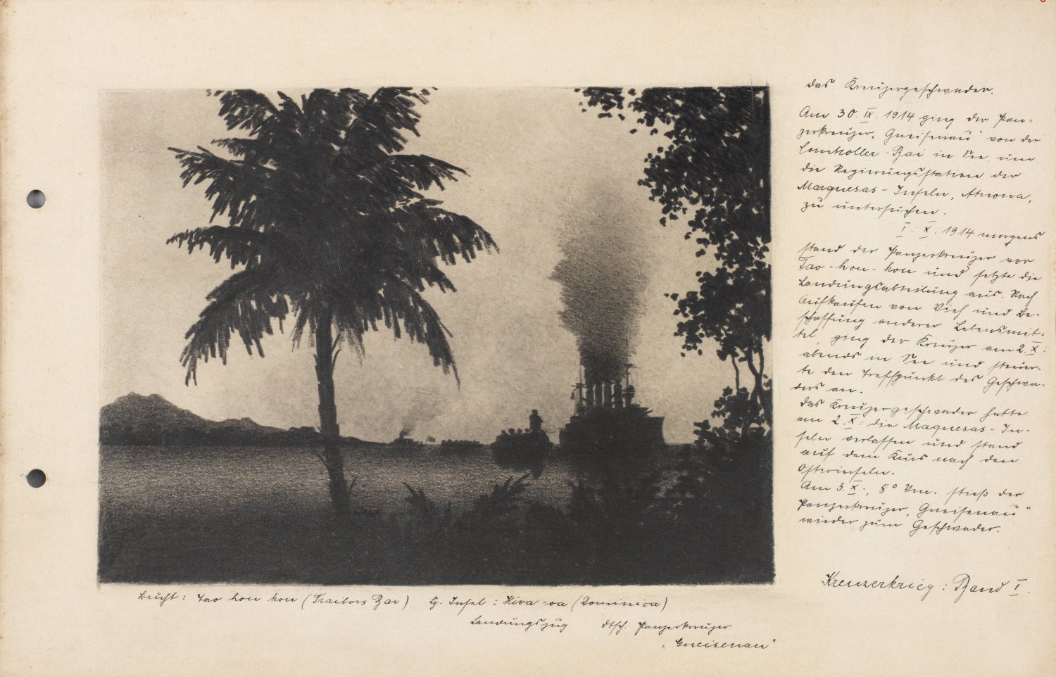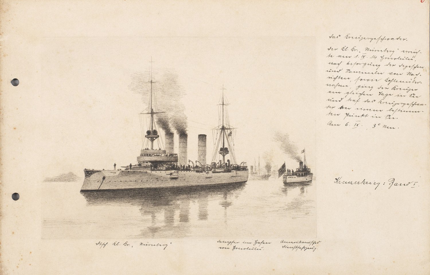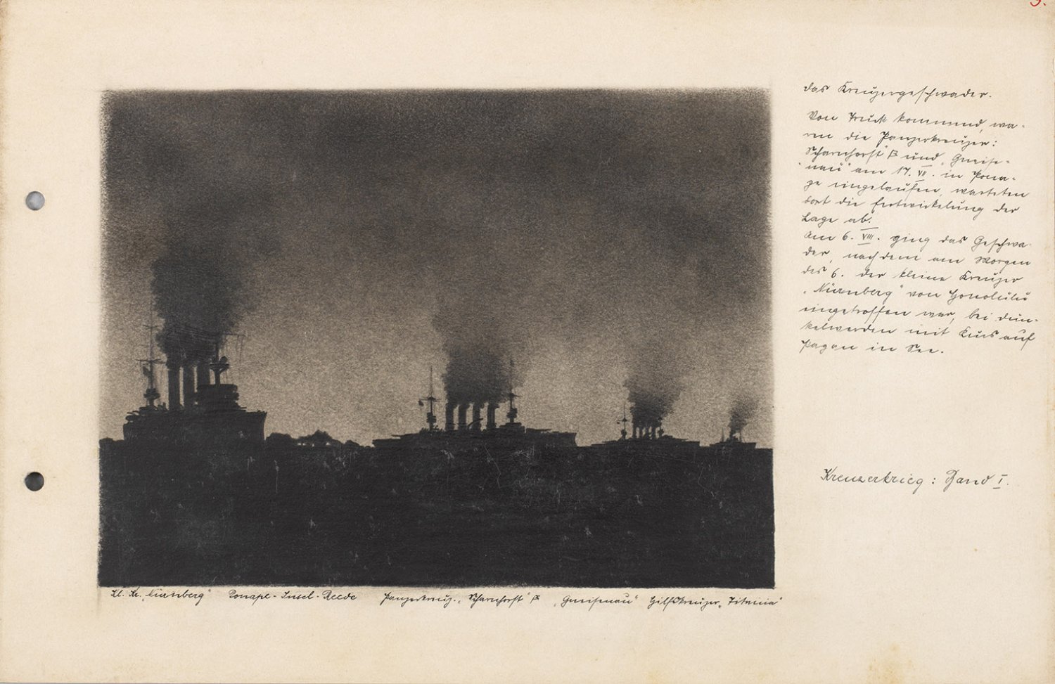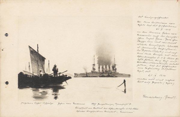 Durch Hans Schubert (1895 - 1971) zeitnah in subtiler Bleistifttechnik ausgeführte, Schwarzweißfotografien gleichkommende Grisailledarstellungen verschiedener Kriegsschiffe und Schlachten auf hoher See. Jeweils zugeordnet Texte und Angaben (in schwarzer Feder und Bleistift), teilw. dat. 1914. Die Bilder dienten offenbar als Vorlagen für ein Buch oder eine Dokumentation der Reichsmarinesammlung im Museum für Meereskunde in Berlin (bestehend 1900-1945). Bleistift/Karton. Originale Lochung. Jeweils ca. 19,5 cm x 30 cm.