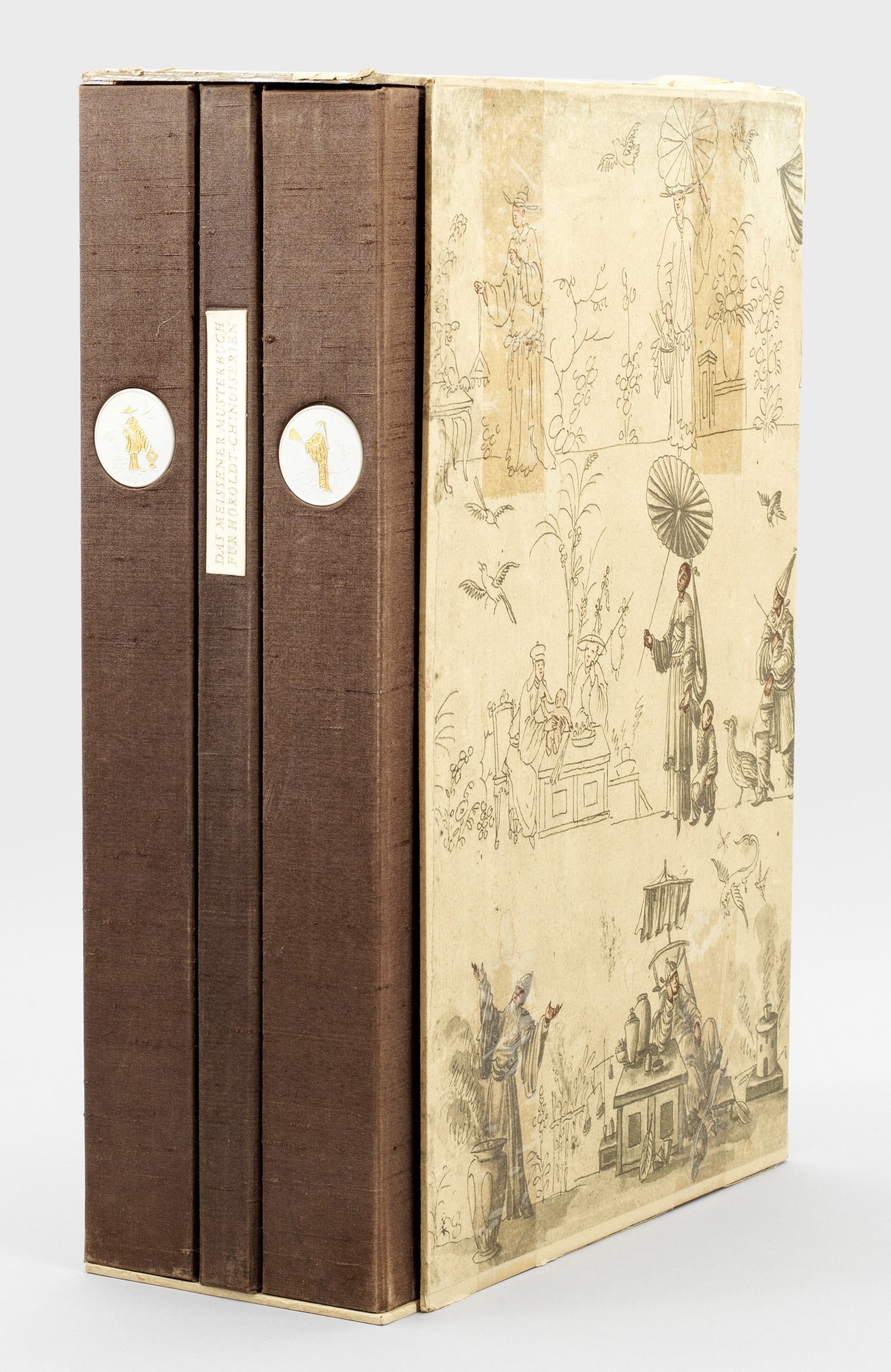 Idion Verlag München, 1978. Zwei dunkelbraune Honanseiden-Kassetten, auf dem Rücken mit eingelassener, goldstaffierter Porzellanplakette sowie Kommentarband von Rainer Behrends in Deutsch, Englisch, Französisch und Spanisch. Nr. 411 der limitierten Weltauflage von 1500 Exemplaren. Ausfaltbare sowie faksimilierte Tafeln mit über 180 Abb. der Meissner Musterblätter unter Seidenfähnchen. Die Originale werden im Museum des Kunsthandwerks Leipzig (Grassimuseum) verwahrt. Original-Schuber besch.; Nicht kollationiert. 36 cm x 50 cm.