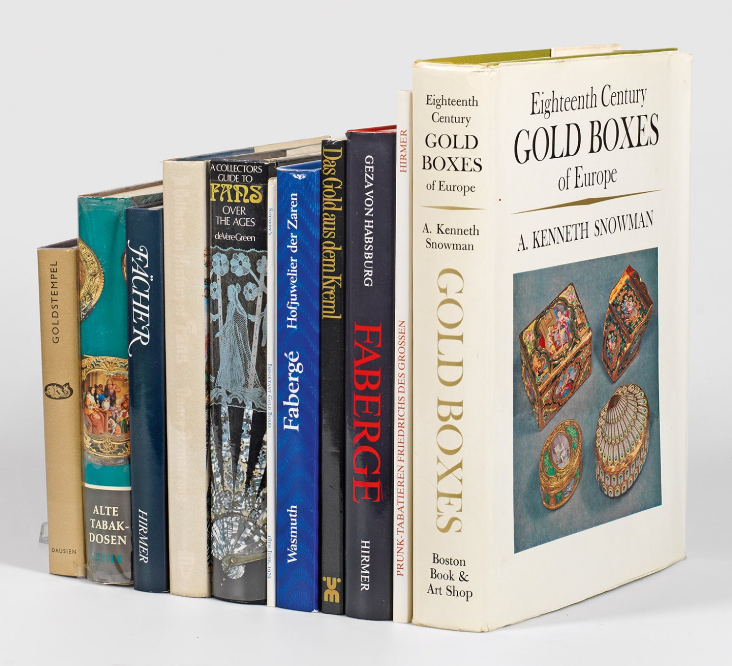 11-tlg.; Clare le Corbeiller "Alte Tabakdosen aus Europa und Amerika", London, 1966. Jan Divis "Goldstempel aus aller Welt", Tschechien, 1978. "Fächer, Kunst und Mode aus fünf Jahrhunderten", Bayerisches Nationalmuseum, München, 1987. Bertha de Vere Green "A Collector´s Guide to Fans over the Age", London, 1975. Dancy Armstrong "A Collector´s History of Fans", London, 1974. "Das Gold aus dem Kreml", Hirmer Verlag, Übersee-Museum, 1989. Geza von Habsburg-Lothringen und Alexander von Solodkoff "Fabergé, Hofjuwelier der Zaren", Tübingen, 1979. Sotheby Parke Bernet & Co. "Important Gold Boxes", London, 1979. A. Kenneth Snowman "Eighteenth Century Gold Boxes of Europe", Großbritannien, 1966. Winfried Baer "Prunk-Tabatieren Friedrich des Grossen", München, 1993. Geza von Habsburg-Lothringen "Fabergé, Hofjuwelier der Zaren" Limburg, 1903. Nicht kollationiert.