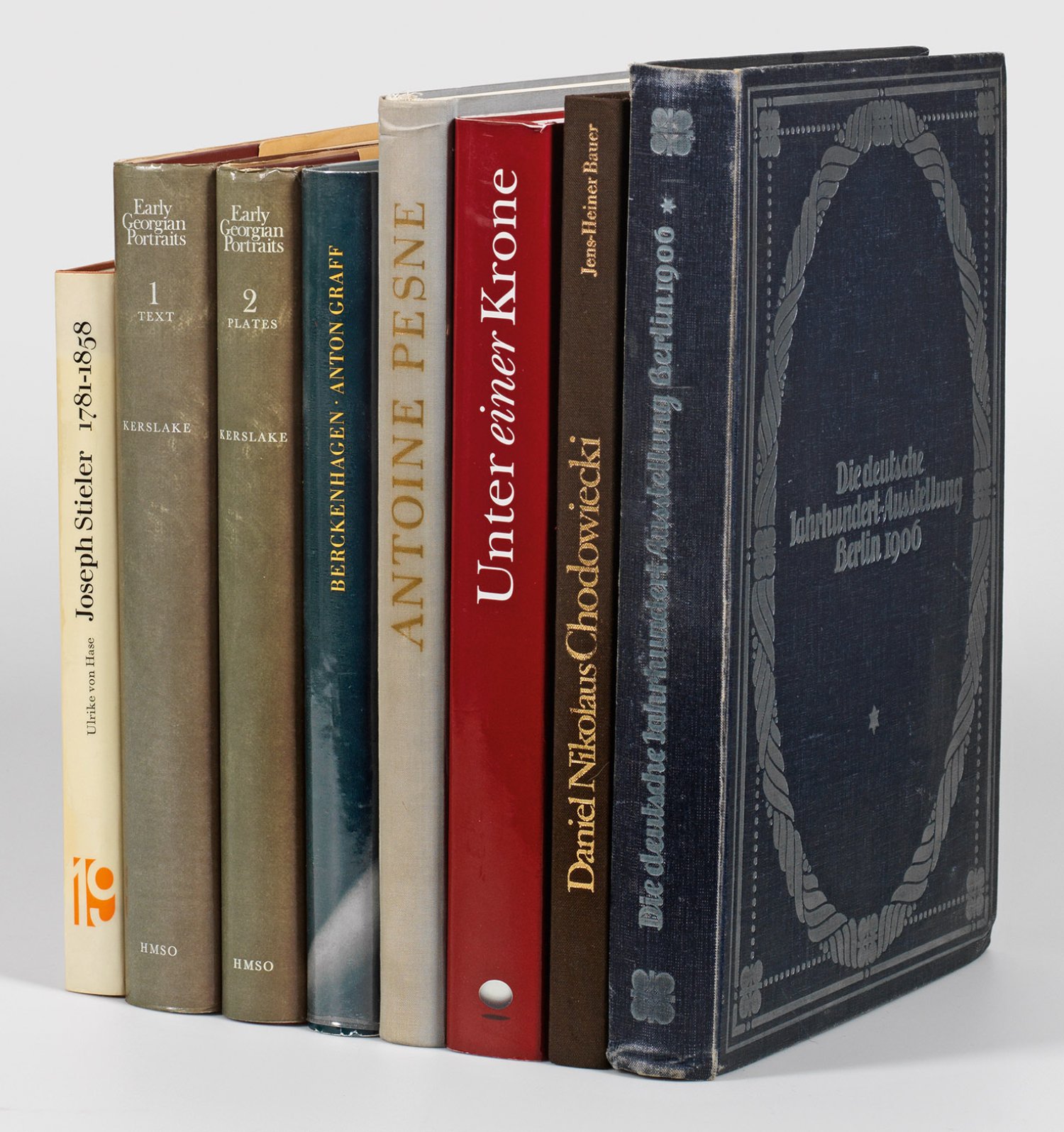 8-tlg.; Ekhart Berckenhagen "Anton Graff, Leben und Werk", Berlin, 1967. John Kerslake "National Portrait Gallery, Early Georgian Portraits", Vol. 1. Text, London, 1977. John Kerslake "National Portrait Gallery, Early Georgian Portraits", Vol. 2. Plates, London, 1977. Ulrike von Hase "Joseph Stieler 1781-1858, Sein Leben und sein Werk, Kritisches Verzeichnis der Werke", Reutlingen, 1971. "Ausstellung Deutscher Kunst aus der Zeit von 1775-1875 in der königlichen Nationalgalerie Berlin 1906", München, 1906. Jens Heiner Bauer "Daniel Nikolaus Chodowiecki", Hannover, 1982. "Unter einer Krone, Kunst und Kultur der sächsisch-polnischen Union", Leipzig, 1997. Ekhart Berckenhagen, Pierre du Colombier, Margarete Kühn, Georg Poensgen "Antoine Pesne", Berlin, 1985. Nicht kollationiert.