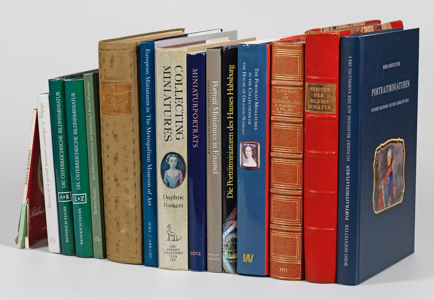 14-tlg.; Bodo Hofstetter "Portraitminiaturen, Hundert Bildnisse aus der Sammlung JRKV", limitiert, Nummer 62, Deutschland, 2018. Leo Schidlof "Die Bildnisminiatur in Frankreich im 17. , 18. und 19. Jahrhundert", Wien und Leipzig, 1911. "Meister der Bildnisminiatur" Amonesta Verlag, Exemplar 82, Wien, 1936. Karen Schaffers-Bodenhausen und Marieke Tiethoff-Spliethoff "The Portrait miniatures in the Collections of the House of Orange-Nassau". Daphne Foskett "Collecting Miniatures", Woodbridge, 1979. Karin Henning-Tavcar "Miniatur Porträts, Die persönlichsten Zeugen der ´Kunstgeschichte", Karlsruhe, 1995. Sarah Coffin und Bodo Hofstetter "Portrait Miniatures in Enamel", London, 2000. Robert Keil "Die Porträtminiaturen des Hauses Habsburg", Wien, 1999. Hans Rieben "Bildnis Miniaturen", Bern, 1951. Bodo Hofstetter und Philippe Plantade "Autissier et le portrait miniature romantique", Belgien, 1998. Heinrich Fuchs "Die Österreichische Bildnisminiatur, von den Anfängen bis zur Gegenwart, A-K und L-Z", Bd.1 und 2, Wien, 1982. Barbara Stadler "Die Bildnisminiaturen der Sammlung Jakob Briner", Winterthur, 1986. Ernst Lemberger "Meisterminiaturen aus fünf Jahrhunderten", Stuttgart, 1911. Grahan Reynolds "European Miniatures in The Metropolitan Museum of Art", New York, 1996. Nicht kollationiert.