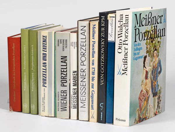 12-tlg.; Waltraud Neuwirth "Wiener Porzellan, Original, Kopie, Verfälschung, Fälschung", Wien, 1979. Waltraud Neuwirth "Porzellanmaler-Lexikon" Bd. 1 und 2, Braunschweig, 1977. Waltraud Neuwirth "Meissener Marken, Original, Imitation, Verfälschung, Fälschung", Wien, 1980. Kat. "Meissener Porzellan", Bayrisches Nationalmuseum, 1710-1810. Kat. "Meißener Porzellan von 1710 bis zur Gegenwart", Kunstgewerbemuseum Köln,1983. Siegfried Ducret "Porzellan des 18. Jahrhunderts", Eltville am Rhein. Winfried Baer "Von Gotzkowsky zur KPM, Aus der Frühzeit des friderizianischen Porzellans", Berlin, 1986. Ludwig Danckert "Handbuch des Europäischen Porzellans" München, 1974. Dr. J. G. Th. Graesse und E. Jaennicke "Führer für Sammler von Porzellan und Fayence", Braunschweig. Otto Walcha "Meißener Porzellan, Von den Anfängen bis zur Gegenwart", Köln, 1973. Waltraud Neuwirth "Der Bindenschild als Porzellanmarke, Orginal, Imitation, Fälschung, Verfälschung", Wien, 1977. Nicht kollationiert.