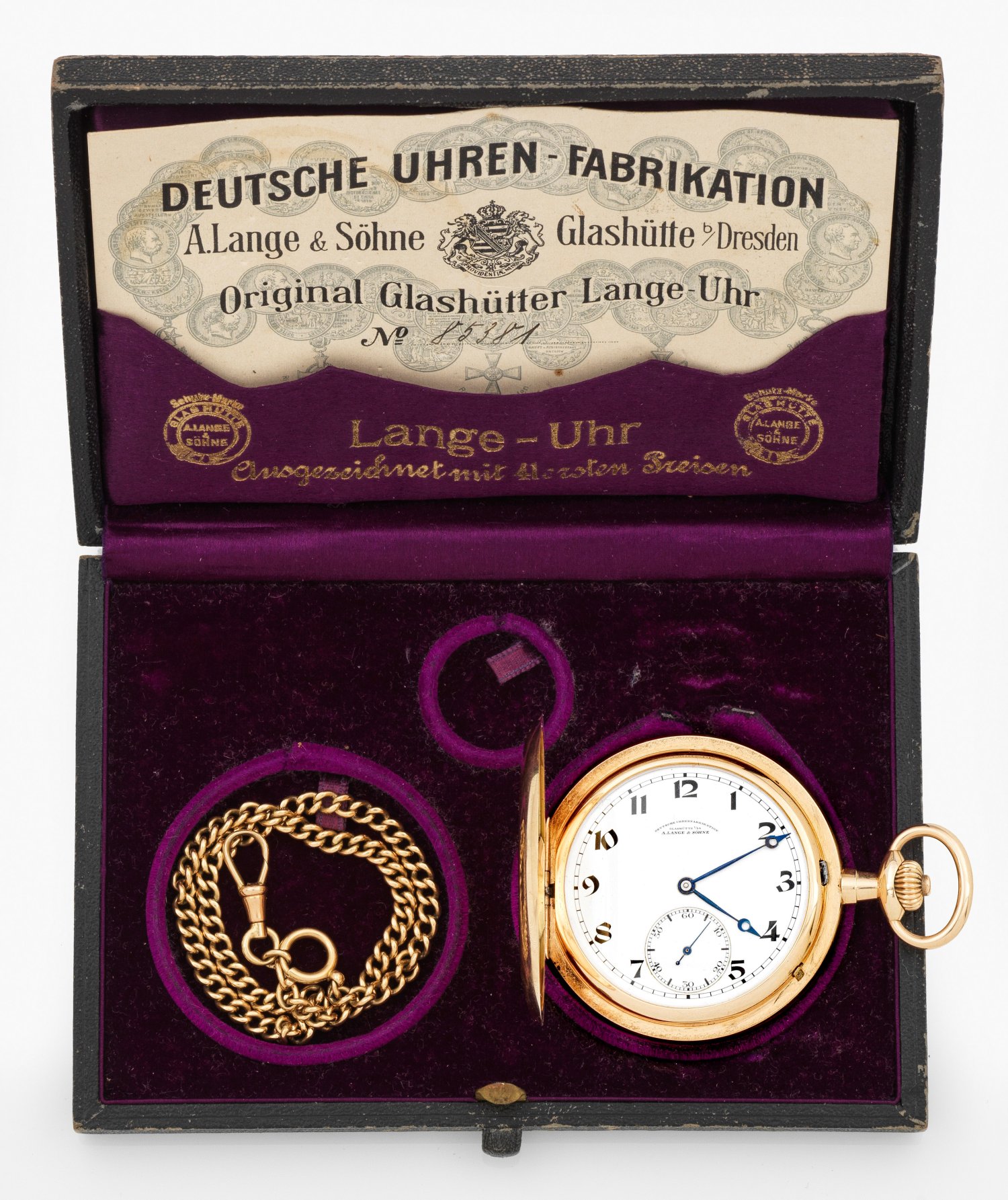 Lange & Söhne, 1923. Gelbgold, gest. 585. Glattes Savonette-Gehäuse und Goldcuvette. Weißes Emailzifferblatt mit arabischen Indexen, kleiner Sekunde, gebläuten Breguetzeigern und Herstellerzeichen. Mechanisches 3/4-Platinenwerk mit Kronenaufzug, Kompensationsunruh und Ankerhemmung. Platine sign. und mit Werknummer 85381. Originalschatulle und Garantiekarte. Uhrenkette (Gelbgold, gest. 585). Gew. ca. 98,52 g. D. ca. 53 mm.