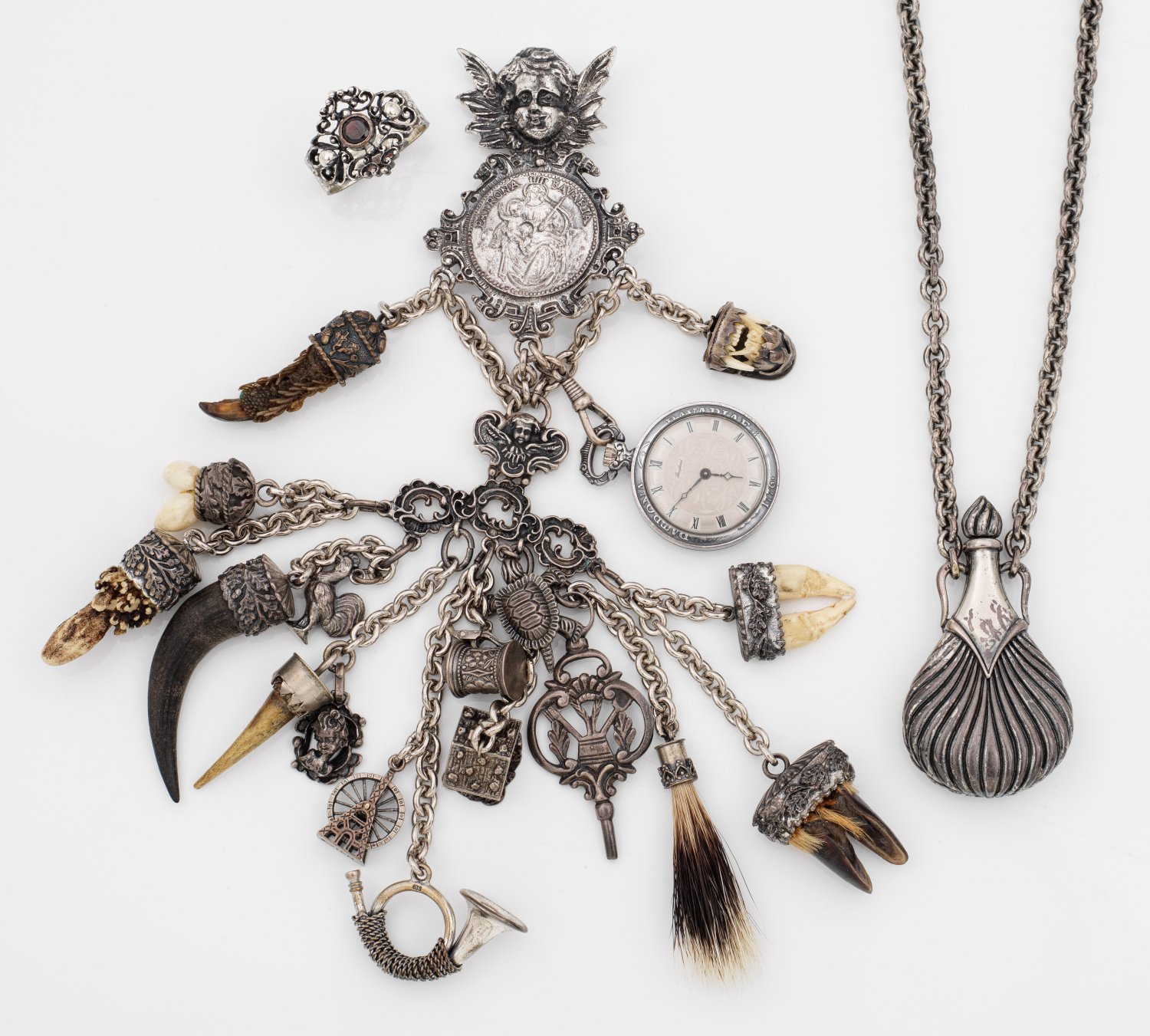 Charivari-Rockstecker, Ring und Kette mit Fläschchen. Silber, gest. 925. Charivari-Rockstecker mit Taschenuhr (Bergland) und diversen Sammel- und Trophäenanhängern wie u. a. Mardergebiss, Dachsbart, Gamskrickerl und Rehzehen. Trachtenring in Ajour besetzt mit einem tiefroten Granat. Ankerkette mit Flaschenanhänger. Ges.-Gew. ca. 366 g.