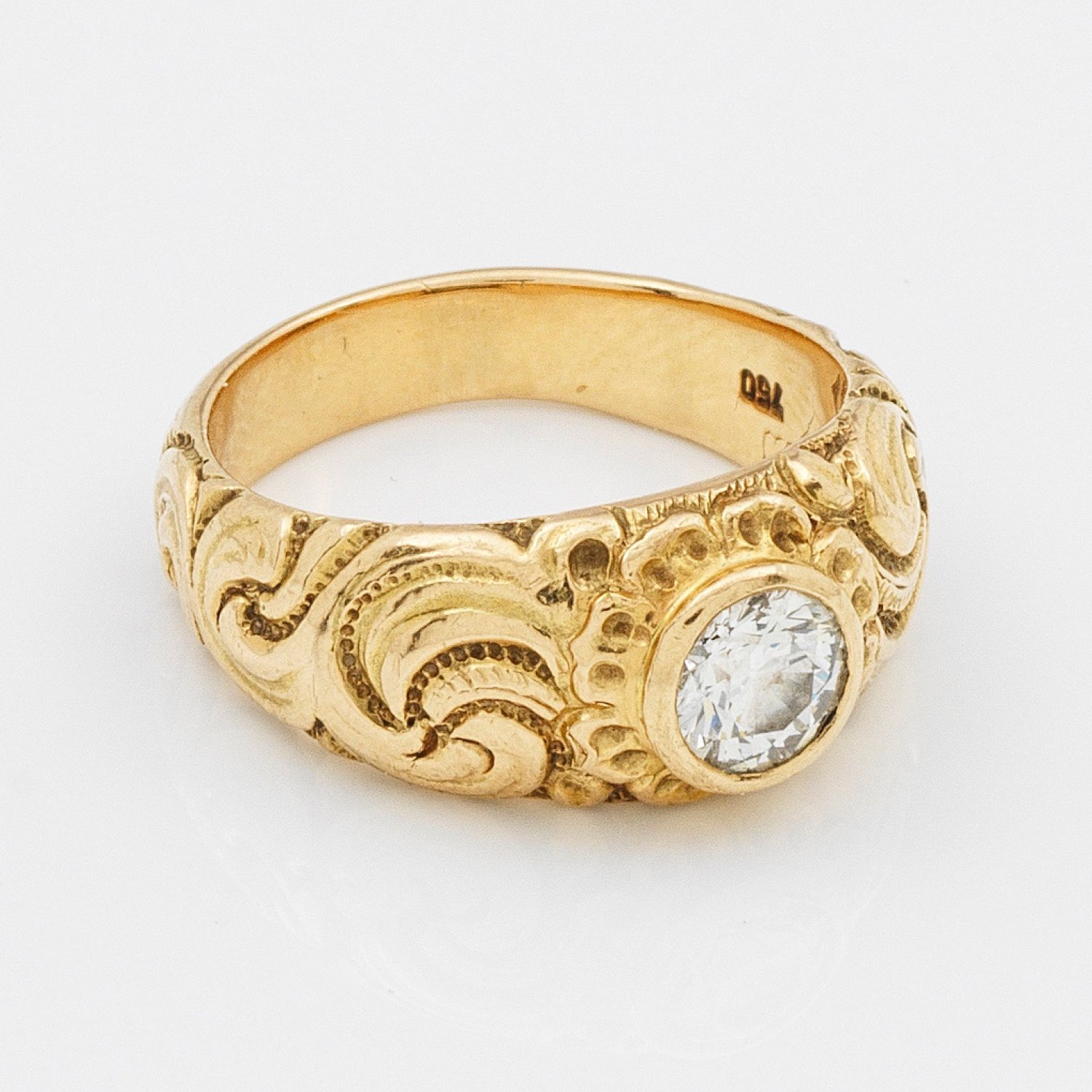Gelbgold, gest. 750. Zentral besetzt mit einem Altschliffdiamnten von ca. 0,50 ct., Ringschiene fein rocailliert. Gew. ca. 9,11 g.