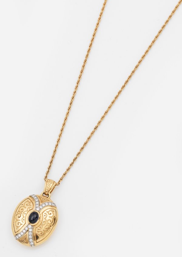 Gelbgold, gest. 18 k. Zentral besetzt mit einem ovalen, tintenblauen Saphircabochon, entouriert von Diamanten. Feine Kordelkette. Ges.-Gew. ca. 23,92 g.