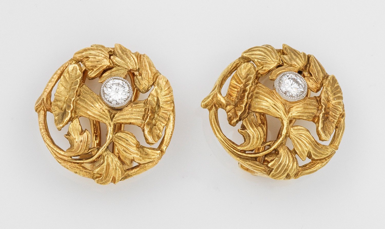 Gelbgold, gest. 750. Jeweils zentral besetzt mit einem Brillanten von zus. ca. 0,20 ct., vegetabil gefasst in Ajour. Ges.-Gew. ca. 7,25 g.