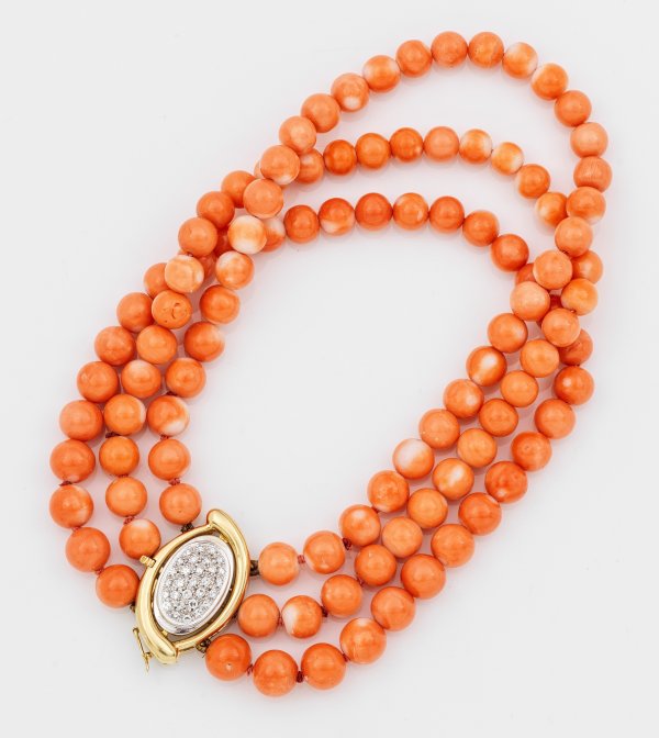 Gelb-/Weißgold, gest. 750. Dreireihige Kette aus lachsfarbenen Korallenperlen von ca. 7,5 mm. Schließe besetzt mit Brillanten. Gew. ca. 60,82 g.