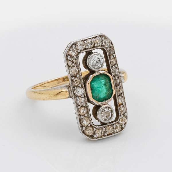 Gelbgold, 14 k. Zentral besetzt mit einem leuchtendgrünen Smaragd, akzentuiert von Diamanten. Gew. ca. 5,12 g.