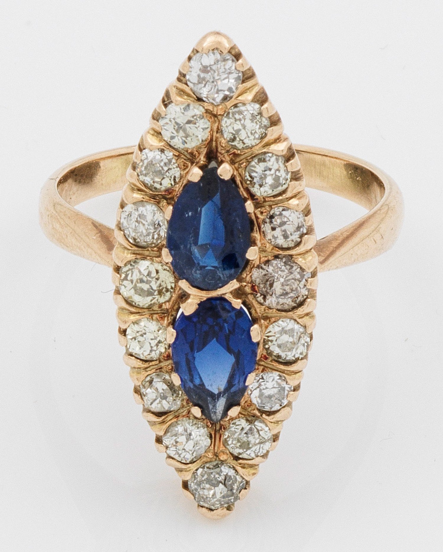 Ring set with blue stones and diamond roses approx. 1,70 ct., in 14 k red gold.