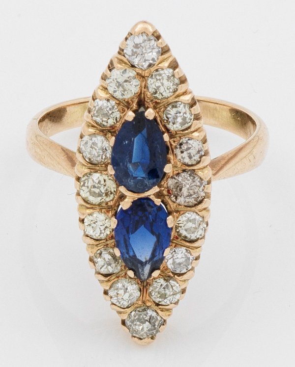 Roségold, gest. 585. Besetzt mit 2 tintenblauen Farbsteinen und Diamantrosen von zus. ca. 1,70 ct.; Gew. ca. 5,38 ct.