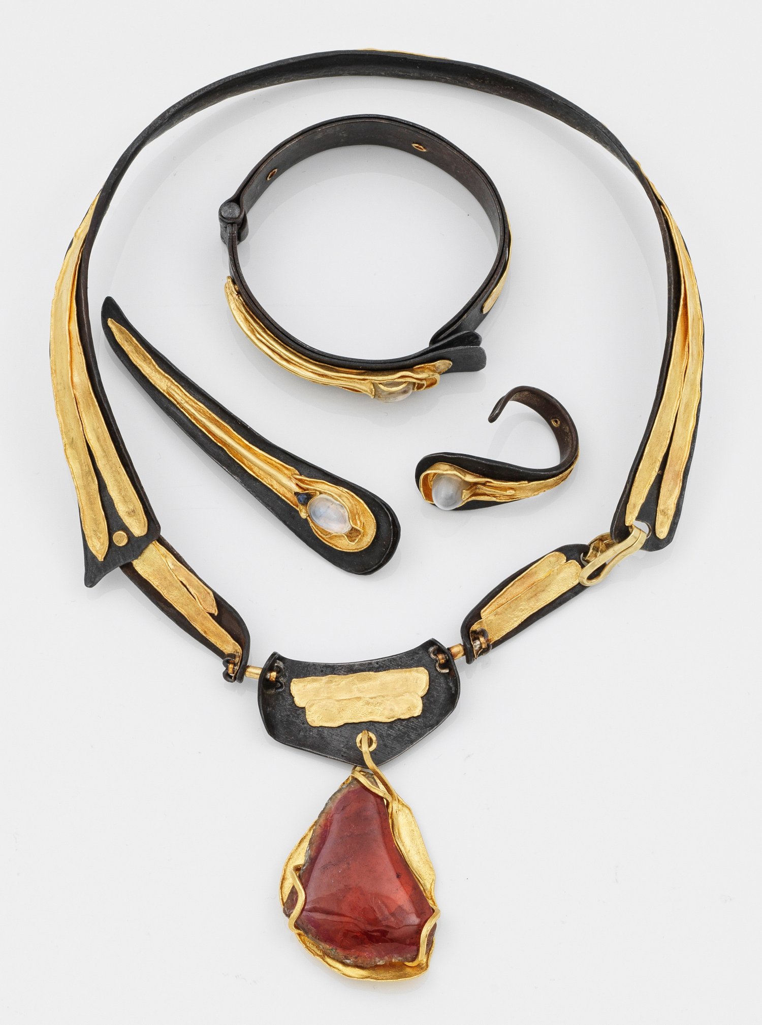 Collier, Armreif, Brosche und Ring. Eisen und Gelbgold, gest. 900. Jeweils zentral besetzt mit einem Mondsteincabochon bzw. mit einem Rubellit. Außergewöhnliche Goldschmiedearbeit. Herstellerzeichen. Ges.-Gew. ca. 167,62 g.