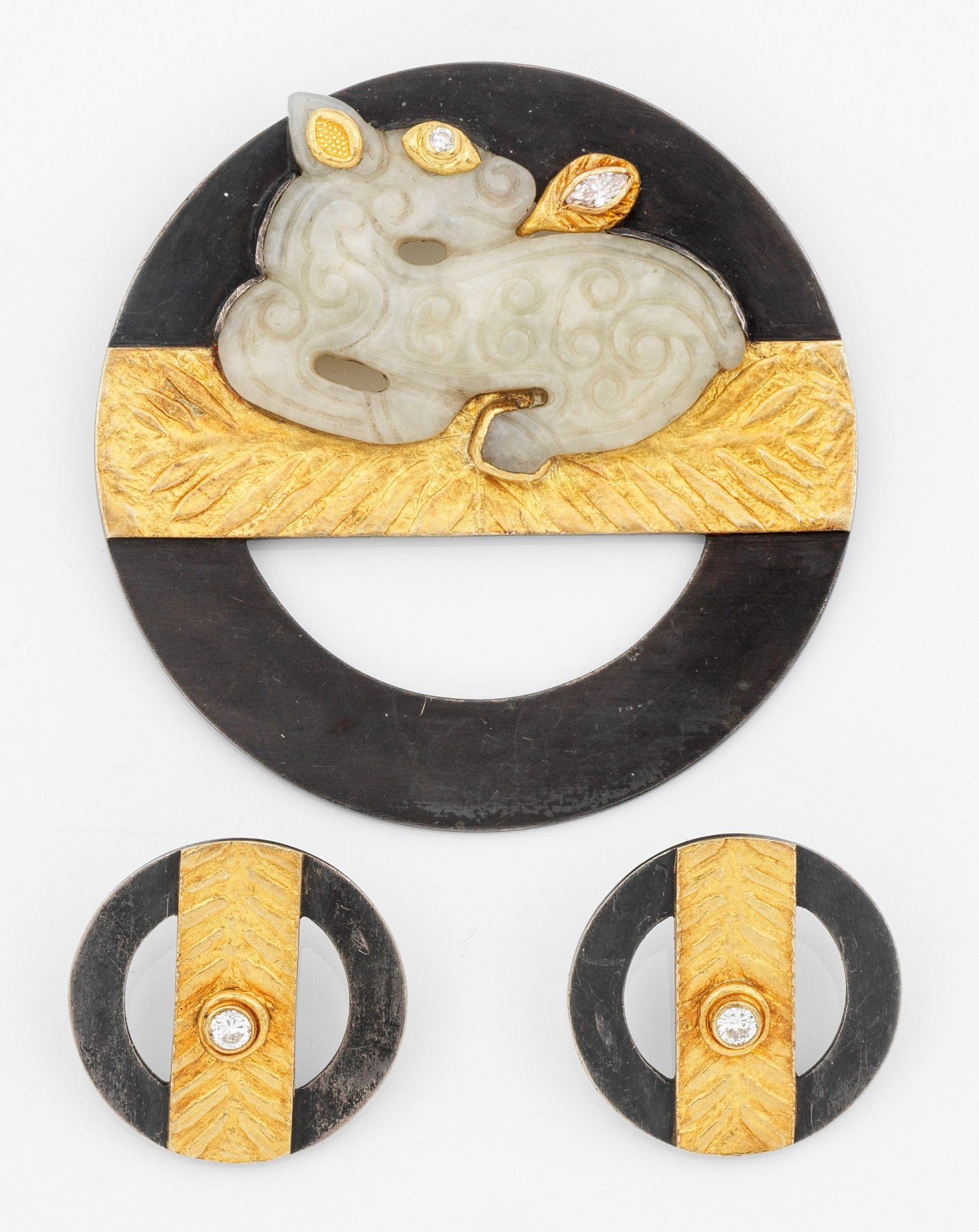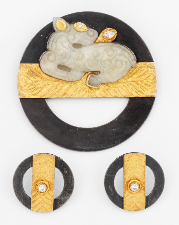 Brosche "Löwenbaby" und ein Paar Ohrclips. Sulfiertes Silber, gest. 925, und Feingold. Brosche besetzt mit heller Jade in Löwenform, akzentuiert durch einen Brillanten von ca. 0,09 ct. (F-G/vvsi) und einer Diamantnavette von 0,16 ct. (F-G/vvsi). Korrespondierende Ohrclips besetzt mit je einem Brillantsolitär von zus. ca. 0,28 ct. (H/if). Ges.-Gew. ca. 54,97 g.
