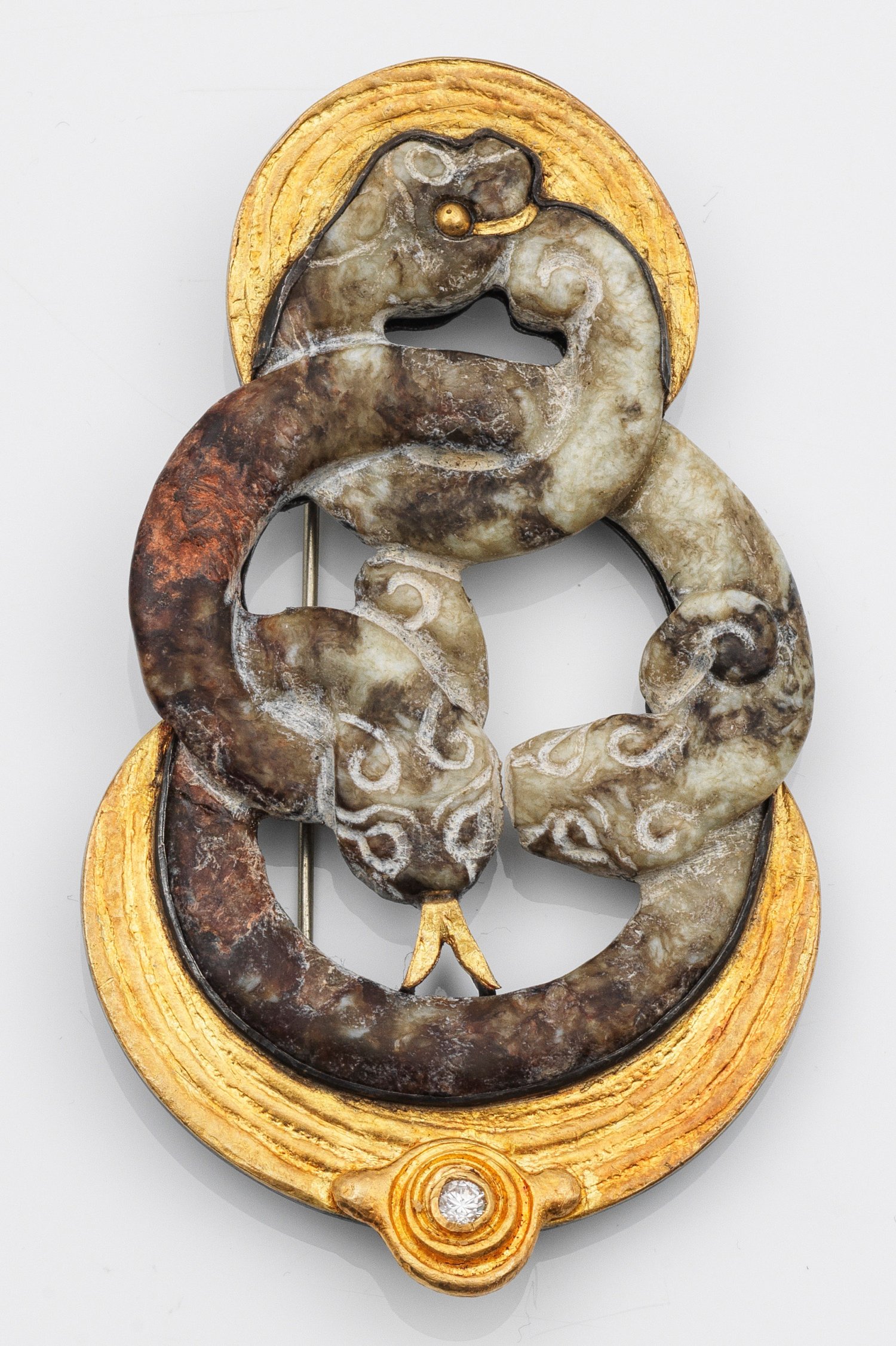 Sulfiertes Silber, gest. 925, und Feingold. Zentral besetzt mit chinesischer Jade (wohl Han Dynastie) als Glücksornament, akzentuiert durch einen Brillant von ca. 0,13 ct tw. Herstellerzeichen. Auch als Anhänger tragbar. Gew. ca. 41,26 g.