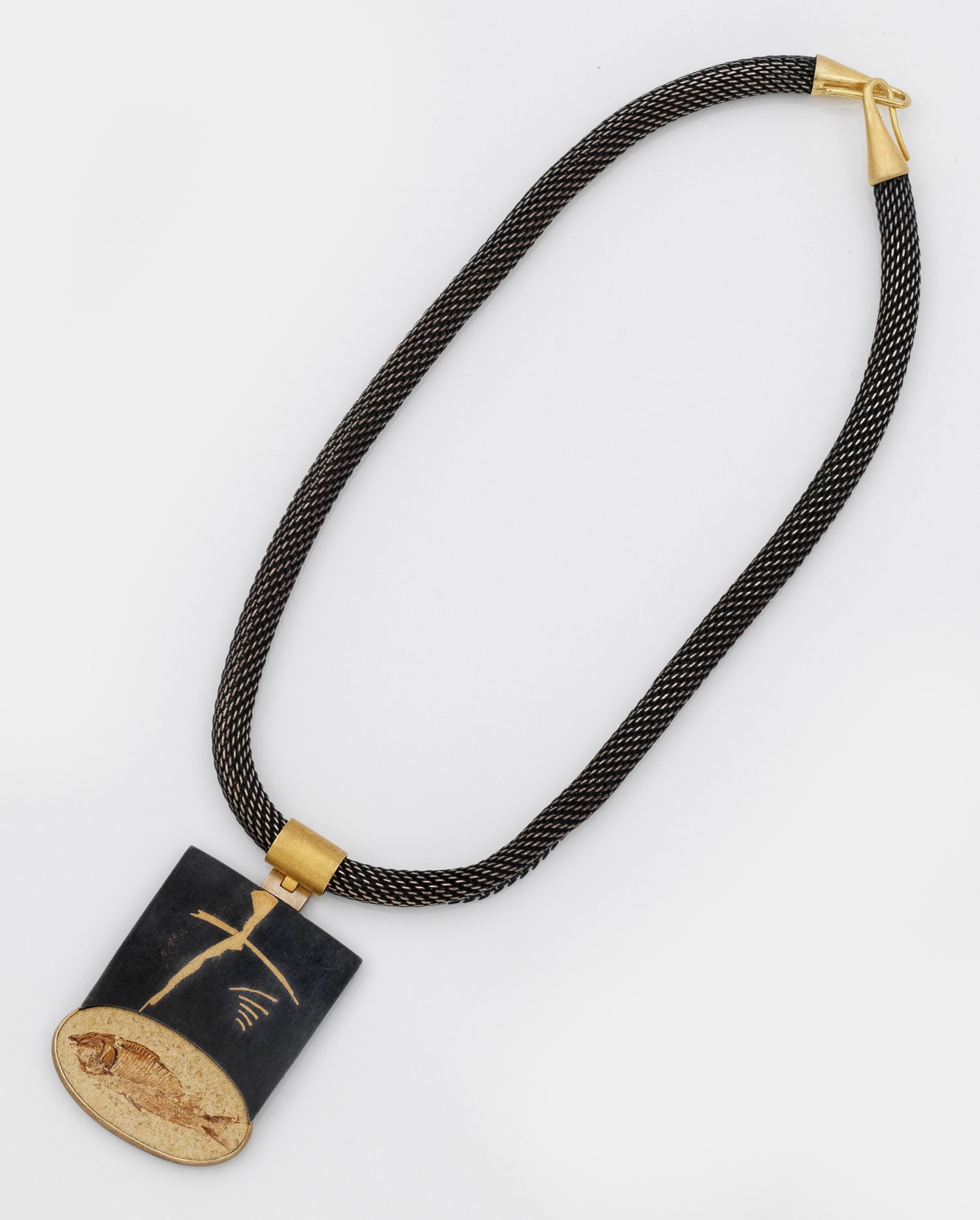 Gelbgold, gest. 900, Weißgold, gest. 750, und Silber, gest. 925. Anhänger mit eingeschlossenen Goldfäden, zentral besetzt mit Fischfossilie. Breite Schlauchkette. Schöne Goldschmiedearbeit. Gew. ca. 65,96 g.