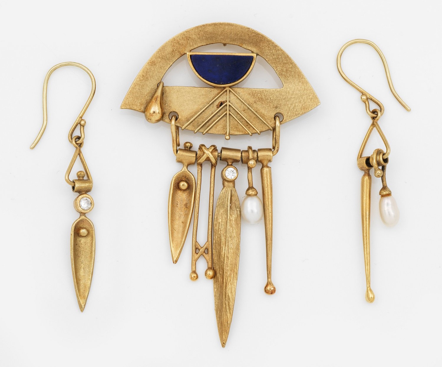 Brosche und Paar Ohrringe. Gelbgold, gest. 585. Besetzt mit Lapislazuli, weißen Perltropfen und Brillanten. Brosche auch als Anhänger tragbar. Moderne Goldschmiedearbeit. Ges.-Gew. ca. 16,00 g.