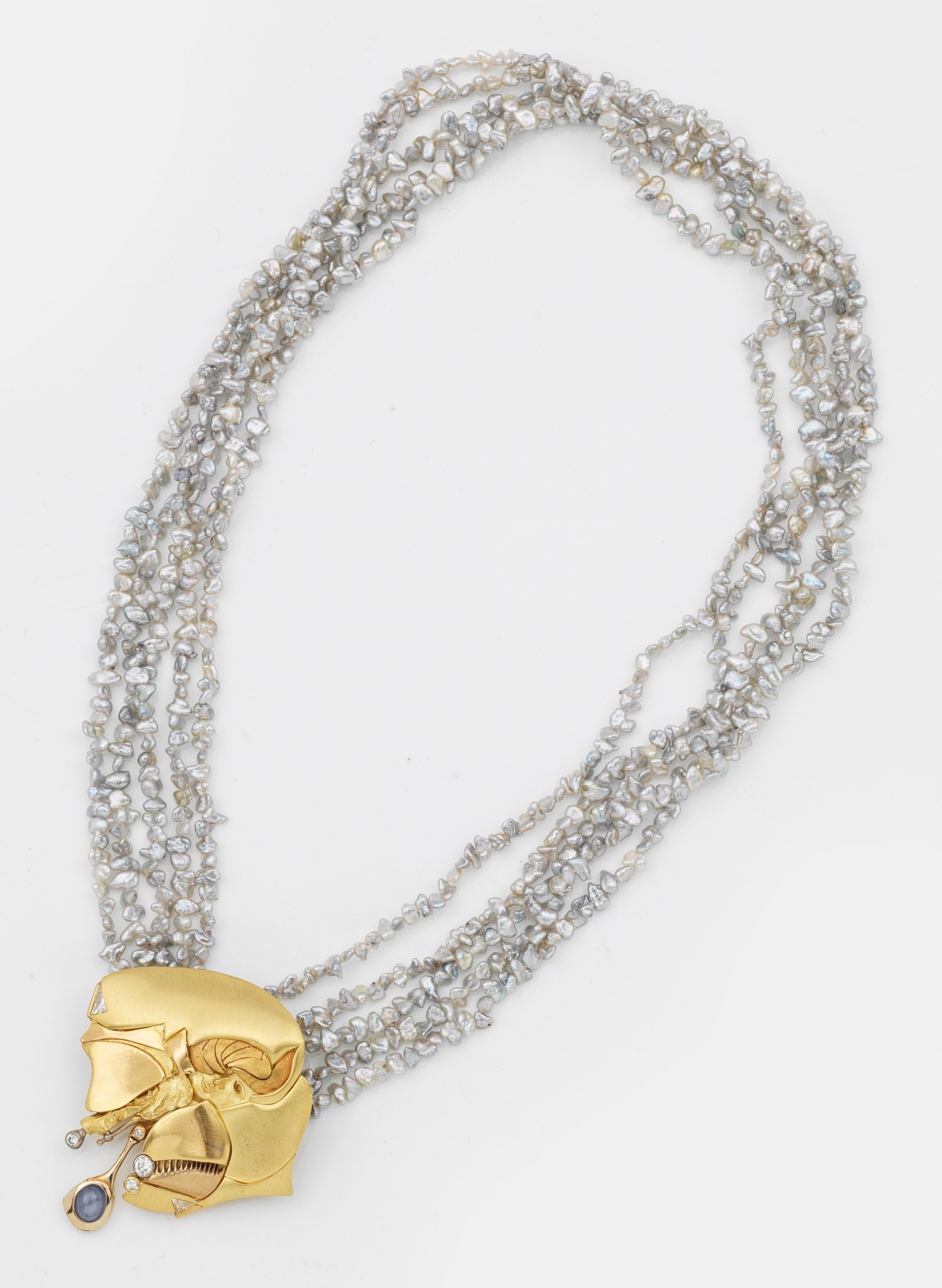 Gelbgold, gest. 750. Fünfreihige Kette aus silbernen Keshiperlen in zartem rosé-grün changierendem Lüster. Amorph gestalteter Anhänger mit Darstellung einer jungen Frau, besetzt mit Brillanten und einem Mondsteincabochon. Schöne Goldschmiedearbeit. Wohl Uwe Böttinger. Ges.-Gew. ca. 43,85 g.