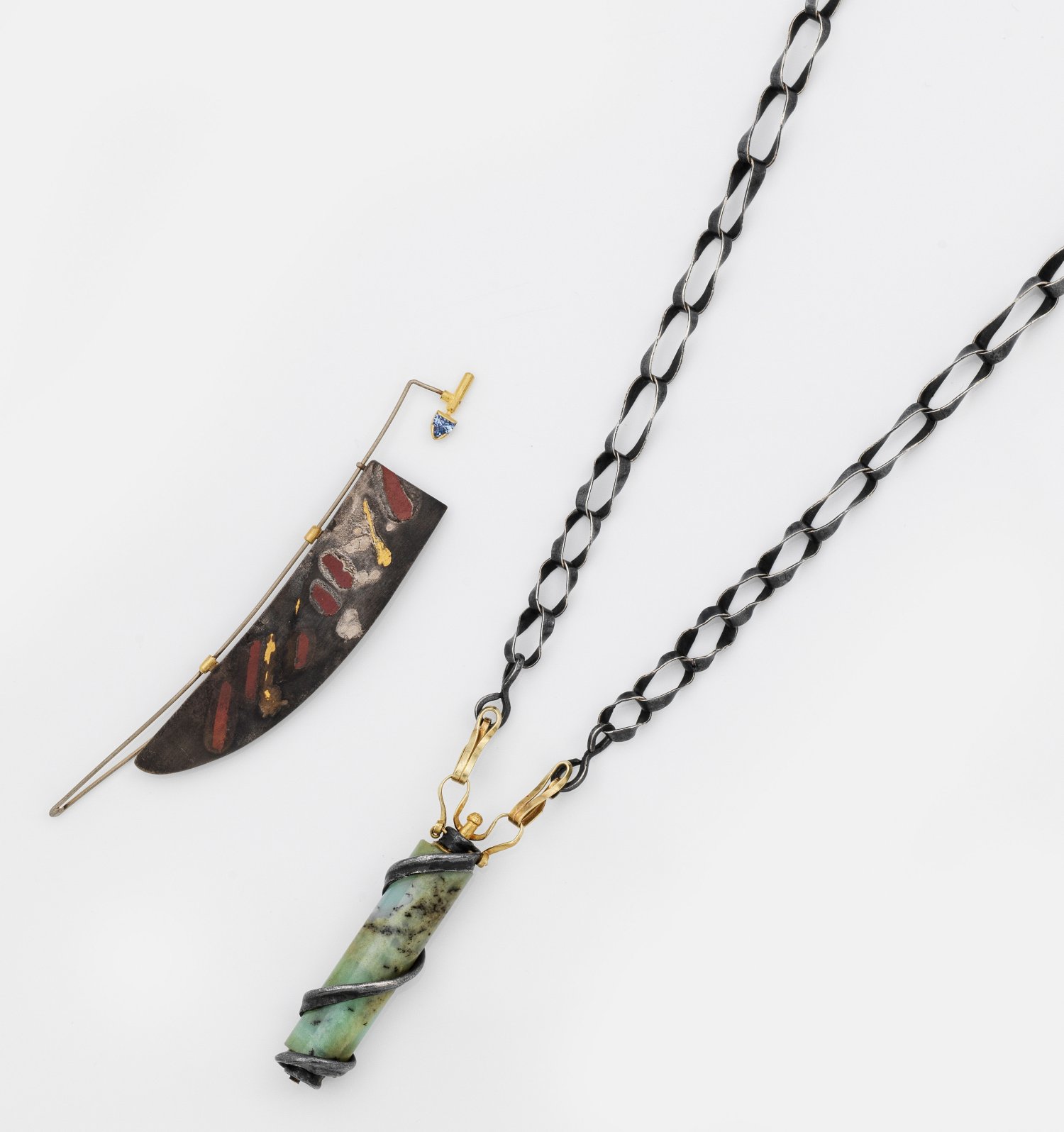 Gold, silver and steel. Link necklace with chrysoprase pendant and a brooch set with tanzanite.