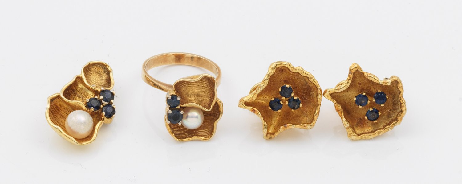 Ring, Anhänger und Paar Ohrclips. Gelbgold, gest. 585. Besetzt mit tintenblauen Saphiren und weißen Zuchtperlen von ca. 6 mm - 7 mm in intensiv rosé-grün changierendem Lüster. Ges.-Gew. ca. 21,53 g.