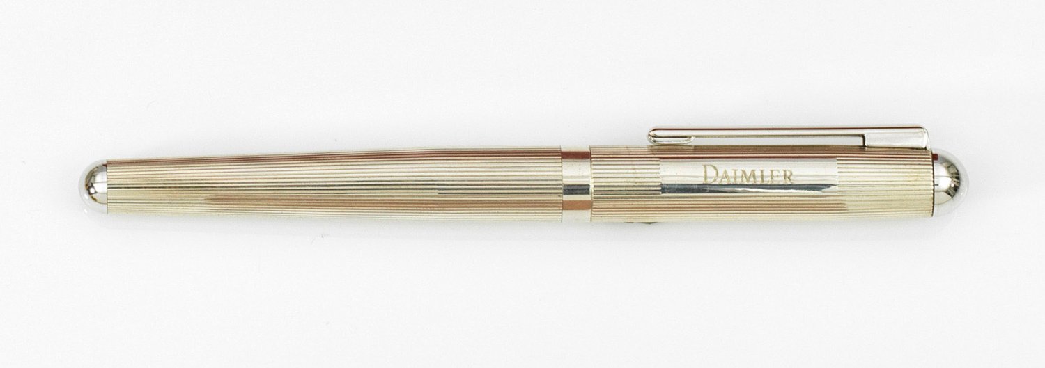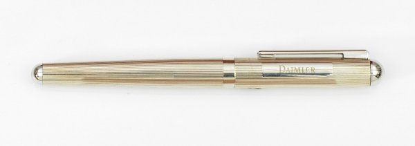 in Etui. Silber und Gold. Konischer Korpus flächendeckend umzogen von feinen Profillinien. Füllerkappe graviert "Daimler". Feder aus 14 ct. Gold. Gest. 925. Gew. ca. 40 g. L. 15 cm.