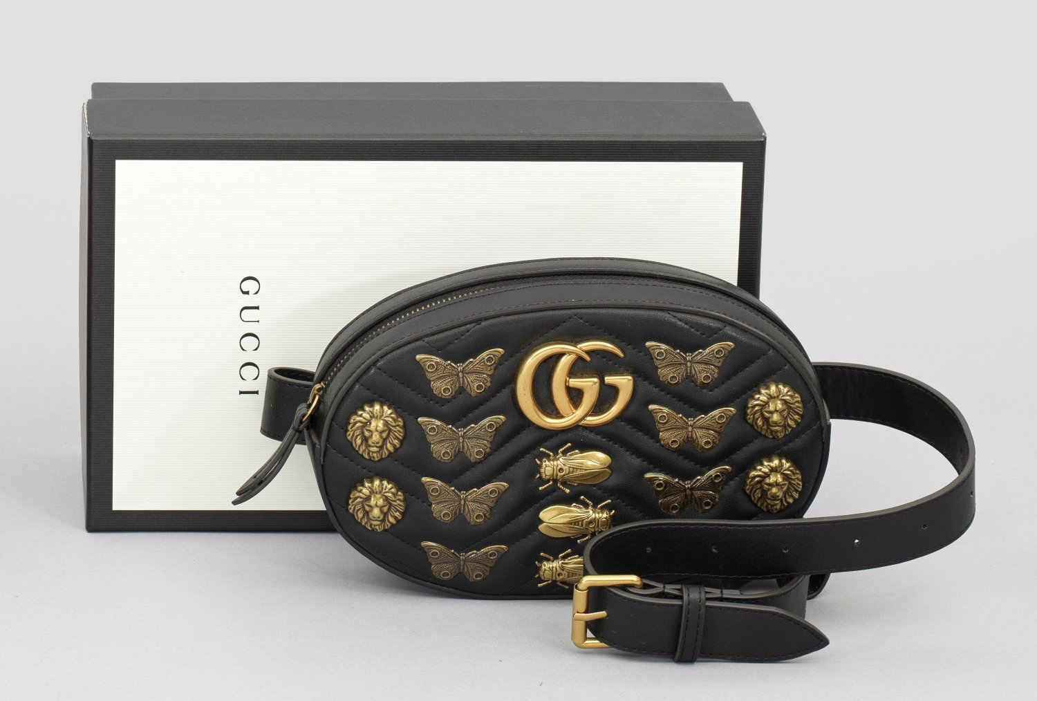 Schwarzes Leder und patinierte Hardware. Ovaler, abgesteppter Korpus mit Reißverschluss, schauseitig mit appliziertem Logo, unterschiedlichen Insekten und Löwenmaskarons. Verstellbarer Hüftgurt. Hauptfach und schmales Nebenfach. Herstellerzeichen sowie Nr. 494294. Staubbeutel und Box. H. 15,5. 24 cm x 5 cm.