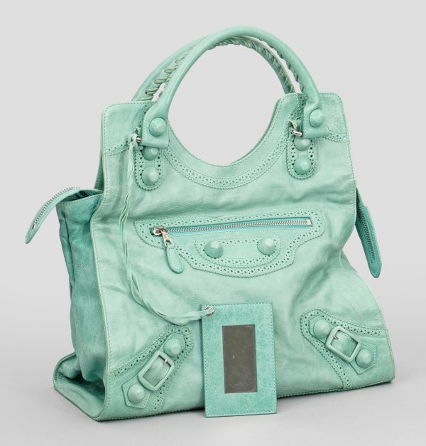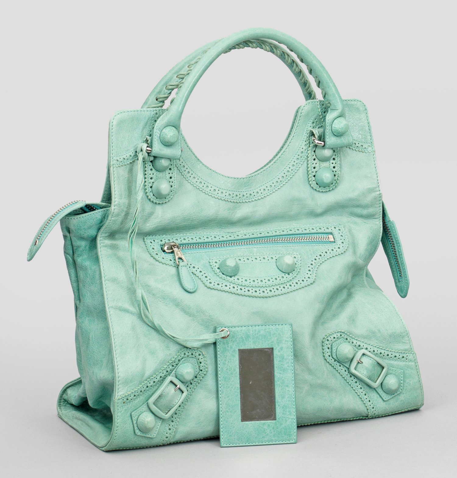 A sea green leather bag by Balenciaga. Manufacturer's mark.