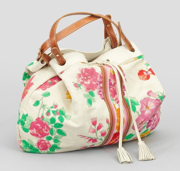 Cremefarbenes und braunes Glattleder sowie polychrom bedruckte Baumwolle und vergoldete Hardware. Gerundeter, beutelartiger Korpus mit Zugverschluss und Quasten sowie zwei schmalen Trageriemen. Geräumiges Innenfach sowie zwei schmale Nebenfächer. Herstellerzeichen. Staubbeutel. H. 21 cm. 45 cm x 17 cm.