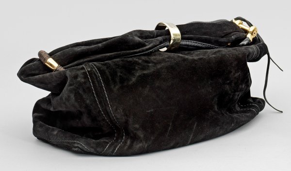 Schwarzes Wildleder und vergoldete Hardware. Rechteckiger Korpus mit breitem Schulterriemen sowie unterschiedlichen Reifdekorationen. Geräumiges Innenfach mit Nebenfächern. Herstellerzeichen. H. 33 cm. 45 cm x 16 cm.
