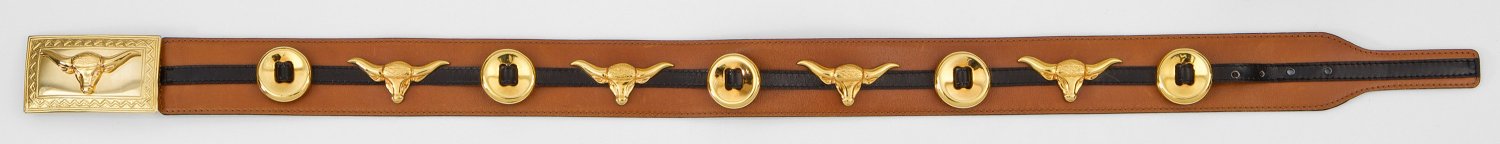 Braunes und schwarzes Leder sowie vergoldete Hardware. Breiter Taillengürtel mit rechteckigem Verschluss. Applizierte Ringmotive und reliefplastische Bullenköpfe. Gr. 38.