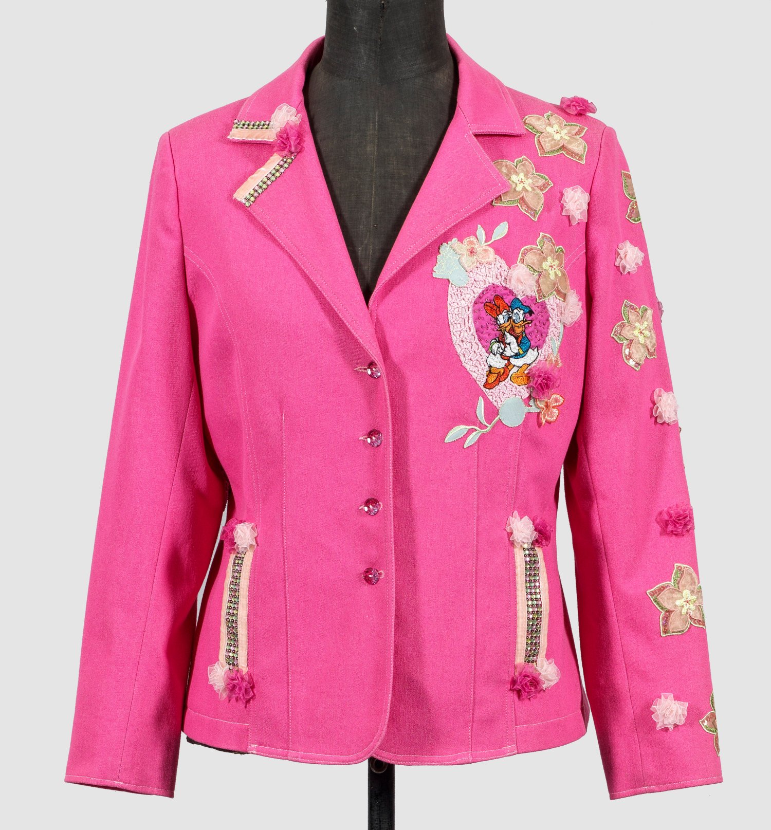 Hüftlanger, tailliert geschnittener, pinkfarbener Blazer mit Strassbesatz. Applizierte, mit Perlen verzierte Herzmotive mit gestickter Darstellung von Donald & Daisy Duck sowie üppige Dekorationen aus Tüllblüten. Herstellerzeichen. Gr. 42. L. 72 cm.