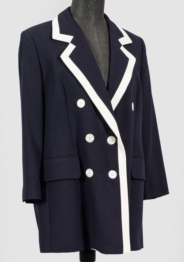 Nachtblauer, gerade geschnittener, zweireihiger Blazer mit breitem, cremefarben abgesetztem Reverskragen sowie großen Knöpfen in Perlmutteroptik. Herstellerzeichen. G. 42. L. 89 cm.