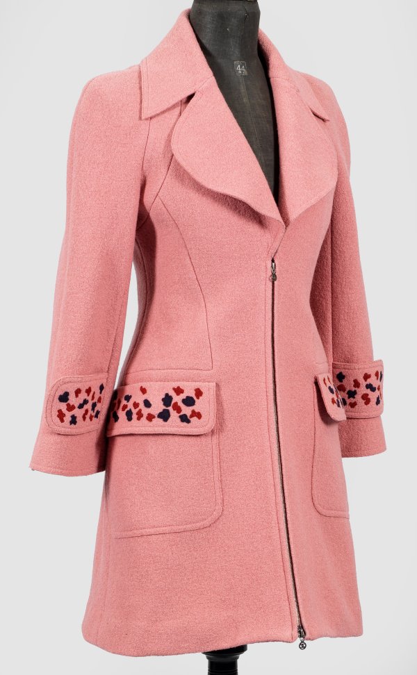 Wolle. Knielanger, tailliert geschnittener, roséfarbener Mantel mit Reißverschluss und breitem, gerundeten Reverskragen. Taschen und Manschetten mit applizierten bzw. gestickten Dekorationen in Dunkelrot und Blau. Korrespondierendes Seidenfutter. Herstellerzeichen. ca. Gr. 36/38. L. 101 cm.