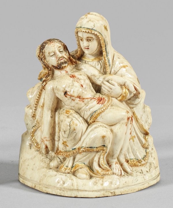 Elfenbein, annähernd vollplastisch geschnitzt, rücks. leicht abgeflacht. Partiell dezente, farbige Bemalung sowie Vergoldung. Kleine, der privaten Andacht dienende Skulptur zur Vergegenwärtigung der Passion Christi. Sitzende, trauernde Maria mit dem vom Kreuz abgenommenen Leib Christi in ihrem Schoß, den Kopf und den linken Arm Christi mit ihren Händen stützend und dessen Figur zur rechten Seite dem Betrachter entgegenhaltend. Dezente Bemalung des gemusterten Gewandes Mariens mit blau-goldenem Saum, die Wundmale Christi in Rot akzentuiert. In der feinen bildhauerischen Arbeit und in der Bemalung stiltypisches Objekt der indo-portugiesischen Schnitzkunst. H. 10,2 cm.