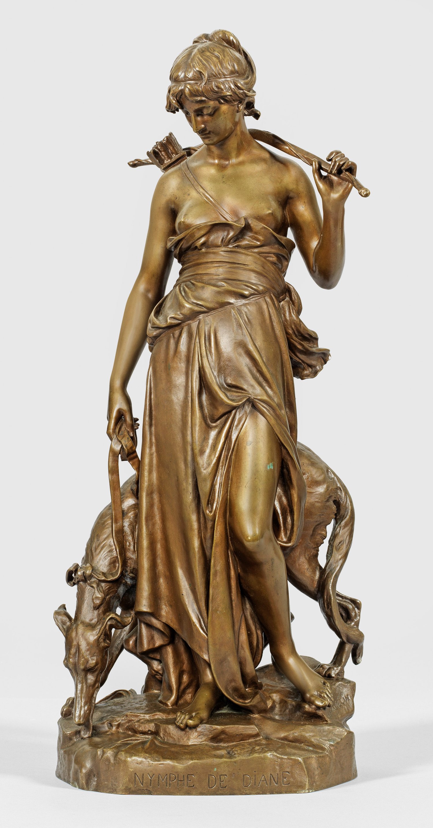 Bronze, braun patiniert. Sign. u. betitelt; Gießerinschrift "F. Barbedienne Fondeur" und runder Stempel "Réduction Mécanique A. Collas Brevete" (in Versalienen). Vollplastische, fein ausgeführte Darstellung der Jagdgöttin als anmutiger Halbakt mit geschultertem Bogen und Pfeilköcher, an ihrer rechten Hand den angeleinten Hund führend. Aizelin studierte bei Augustin-Alexandre Dumont und beschickte 1852-1897 regelmäßig den Pariser Salon, auf dem er 1885 auch das originale Modell für die "Nymphe de Diane" zeigte (Nr. 3276), 1867 wurde Aizelin Ritter der Ehrenlegion, 1889 gewann er eine Goldmedaille auf der Weltausstellung. H. 57 cm.