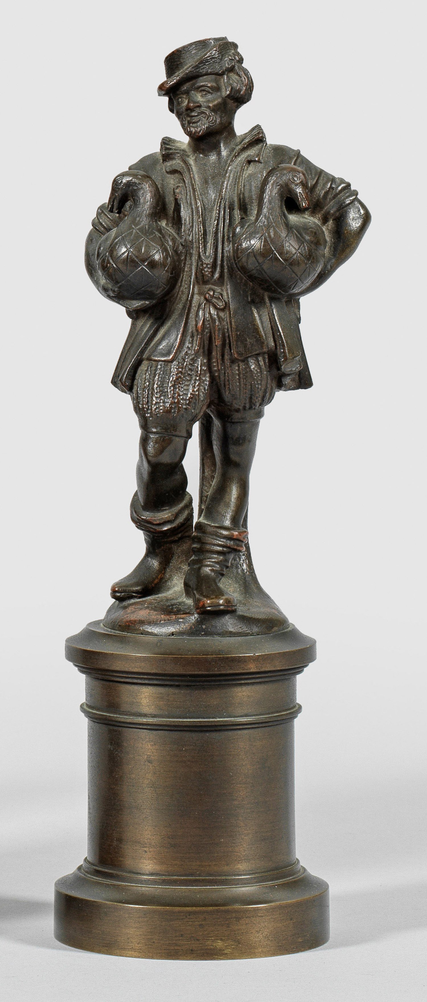 Bronze, dunkelbraun patiniert. Guss des 19./20. Jhs. durch die Kunstgießerei Lenz, Nürnberg (inschriftlich bez. "Lenz"). Stark verkleinerte, im Detail fein ausgeführte Statuette nach den um 1550 geschaffenen "Gänsemännchenbrunnen" in Nürnberg, H. 27,8 cm.
