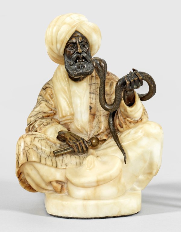 Dunkelbraun patinierte Bronze sowie getönter Alabaster. Sign.; Ausführung wahrscheinlich durch die Aktiengesellschaft Gladenbeck in Berlin-Friedrichshagen, um 1900. Auf einer ovalen Plinthe sitzender, arabischer Schlangenbeschwörer in orientalischer Tracht mit Turban, der in seiner linken Hand eine Kobra hält, in seiner rechten eine Flöte. Ger. best.; H. 30,5 cm.